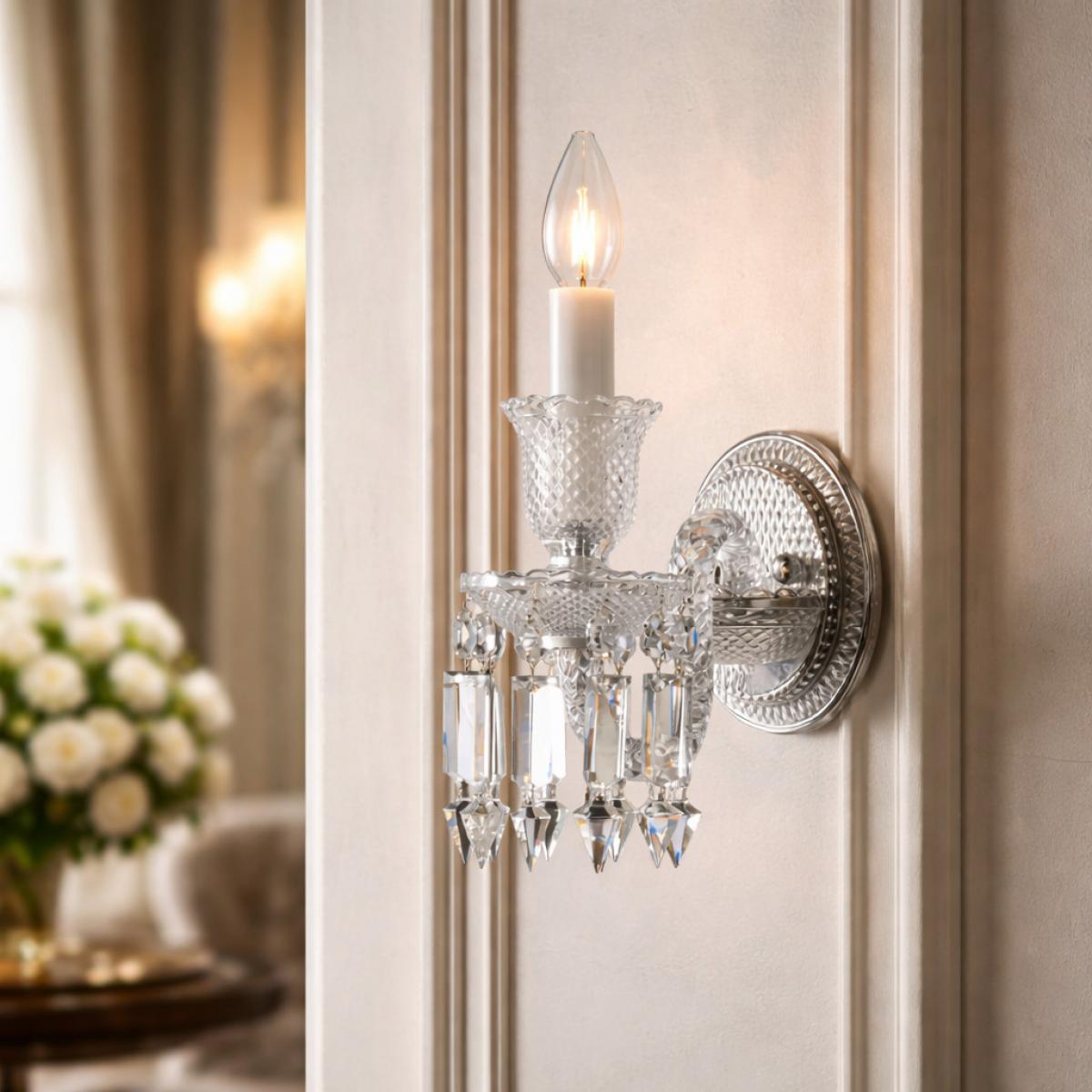 Designed for wall-mounted installation, this sconce offers an intentional, vertical composition that frames your space beautifully. Its clear crystal components and structured central support hold the shade and decorative elements in a clean, balanced arrangement. Whether your décor leans traditional, glamorous, or French-inspired, the fixture’s sparkle and soft illumination work together to create a welcoming mood. If you’re searching for a wall mounted lamp that adds shine, character, and a dramatic finish, this crystal wall lighting fixture delivers with its faceted backplate, refined crystals, and hanging prism details—perfect for elevating foyers, lobbies, and everyday indoor rooms. Explore our luxury wall lamp collections to discover refined lighting designs that add elegance, warmth, and architectural charm to your interiors.