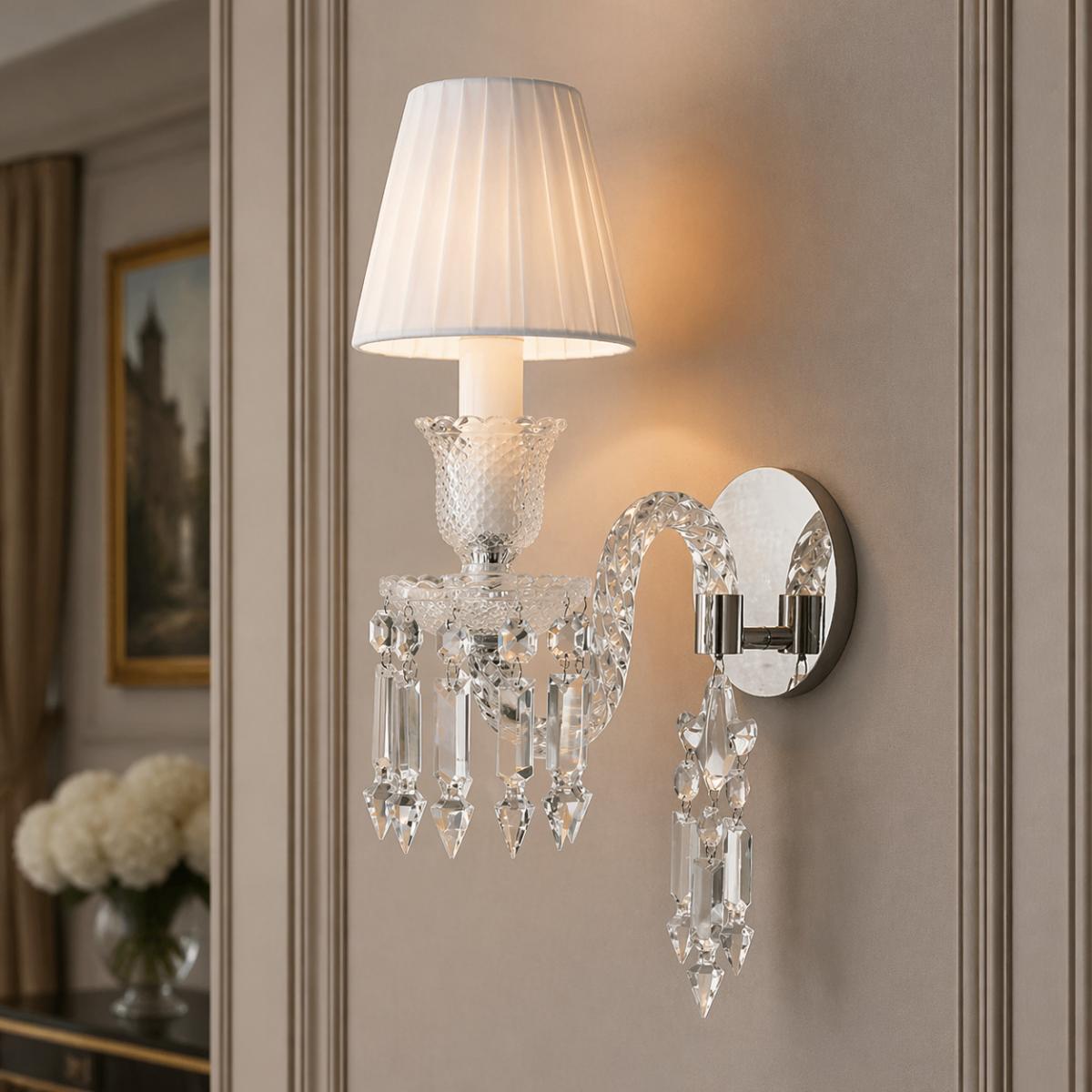 luxury wall lamp presence meets Art Deco glamour in this Glamorous Art Deco Wall lamp. The design pairs a crisp white pleated drum shade with a polished chrome structure for a clean, luminous silhouette. Most striking is the oval mirrored back, which amplifies sparkle by reflecting the crystal arrangement from multiple angles. As light warms through the shade, the mirror and crystal prisms work together to create an elevated, chandelier-style glow—perfect when you want a crystal wall lamp effect without taking up floor space. Explore our luxury wall lamp collections to discover refined lighting designs that elevate your walls with timeless elegance and ambient sophistication.