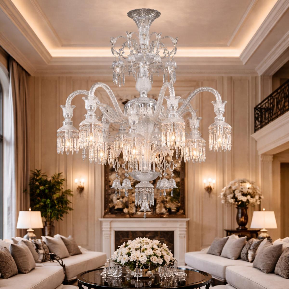 Each arm is shaped to hold candle-style bulb sections, bringing an intentional candle-lit character to the design while keeping the form refined and structured. The chandelier’s many curved arms are complemented by layered crystal cluster elements around the lower tier, forming a dense, shimmering look without visual clutter. This Crystal Chandelier is finished with a polished metal frame in a silver tone, helping the clear glass crystal stand out with bright reflections.
