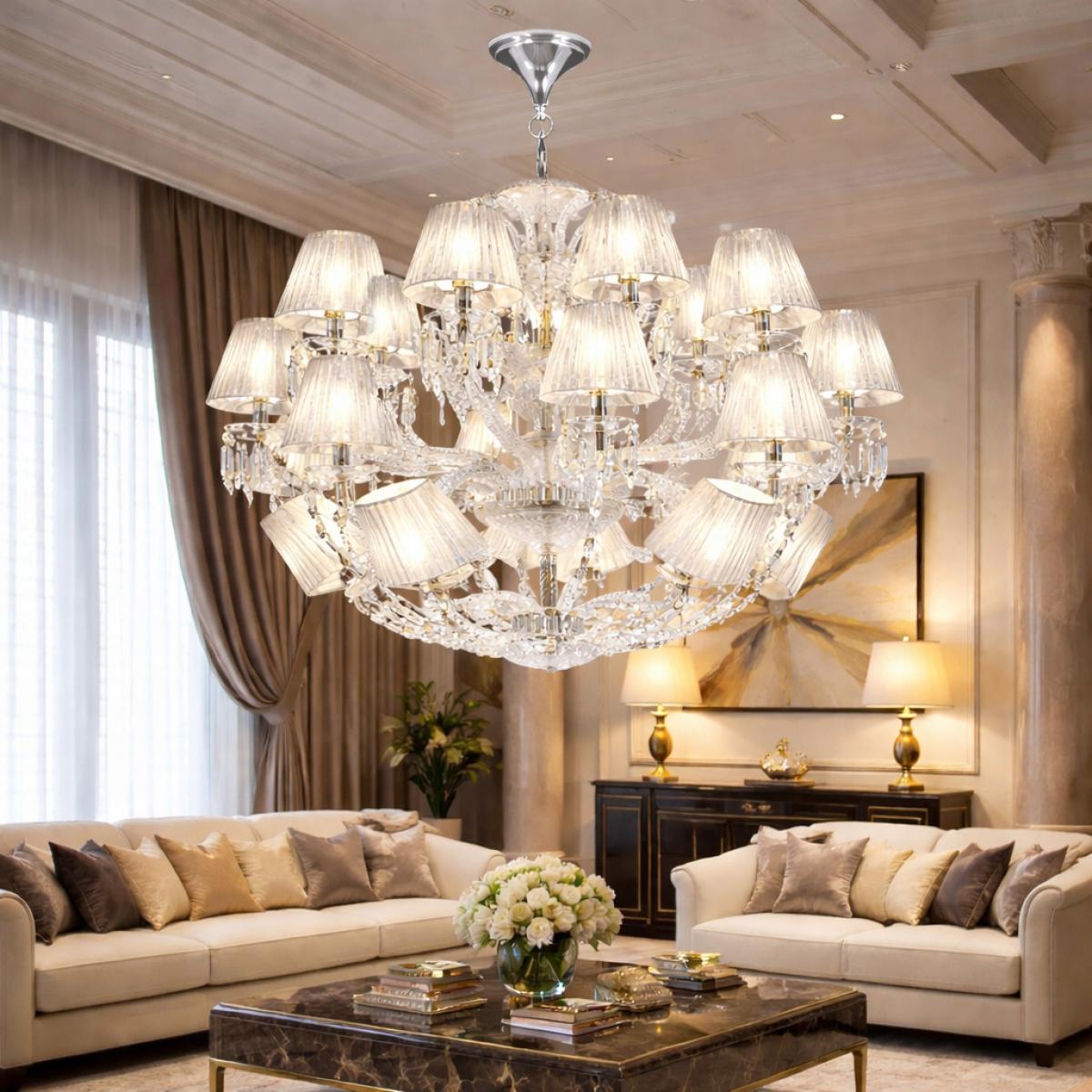 Behind the elegant form, the lighting architecture is made to sparkle. Metal supports radiating arms that hold pleated fabric lampshades, helping soften the light for a warm, flattering glow while reducing harsh glare. Clear crystal and prism-like details catch and reflect the illumination, scattering brilliance across the room and adding a layered sense of depth around the central area. Configured with 15*E14 light points, this Luxury Chandelier is ideal for those who want statement-level presence without compromising on comfort and ambiance. Whether you’re styling a dining room for evening gatherings or adding character to an entryway, the result is a polished, high-impact look.