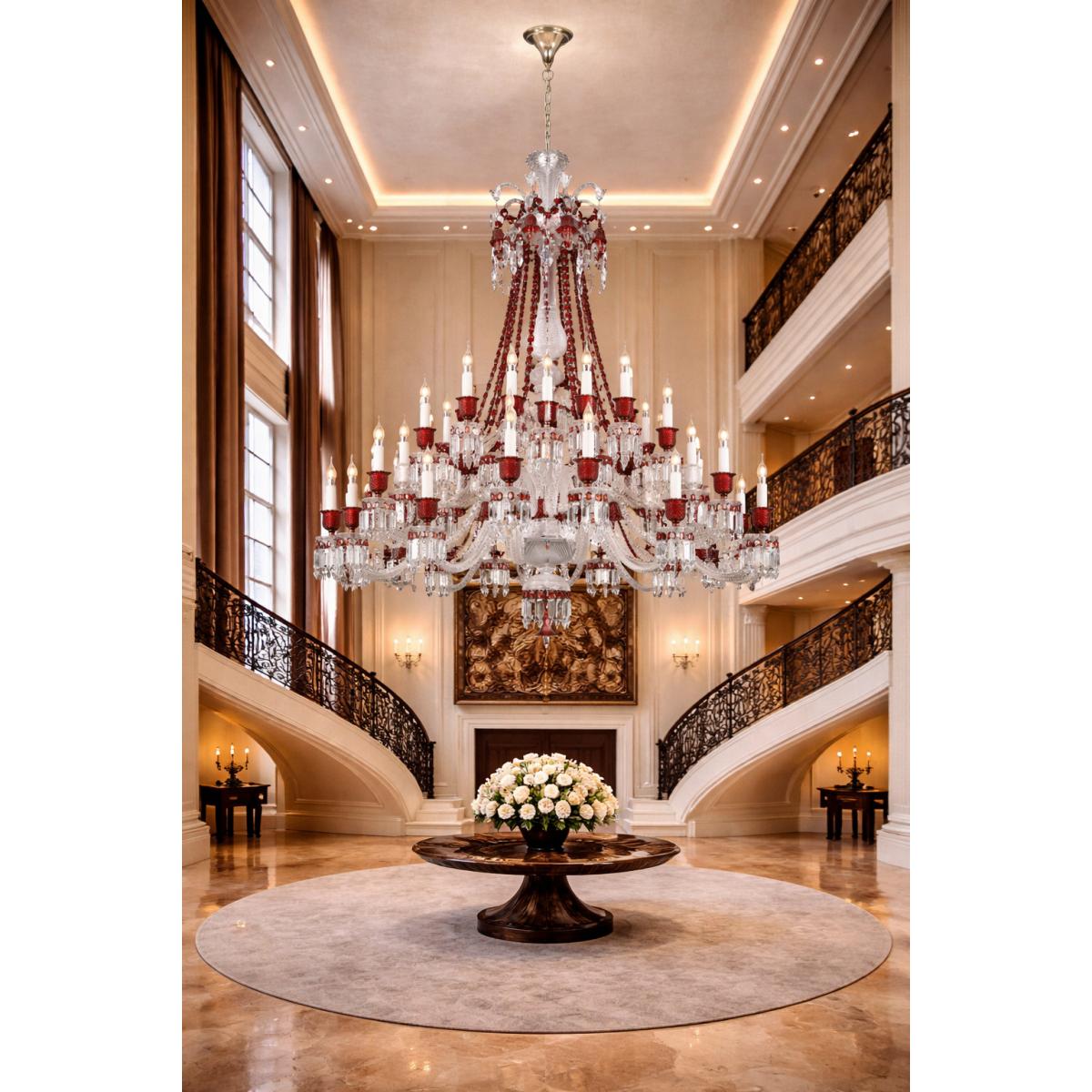 Stylistically, this design leans into a refined modern chandelier sensibility while keeping the decorative richness of traditional crystal silhouettes. The framework shapes a clear, contemporary outline, yet the crystal detailing adds luminous texture and visual rhythm across the arms and tiers. Each drop and prism contributes to a sparkling halo effect above the seating area or dining table, making the chandelier light feel fuller and more dimensional. Red and white identity stays cohesive throughout the display, with red accents used to heighten contrast rather than overpower the clarity of the crystals. This balance helps the chandelier read as one unified design—bold enough for impact, polished enough for everyday elegance. Enhance your interior ambiance by exploring our luxury lighting collection, where timeless design meets refined illumination for sophisticated living spaces.