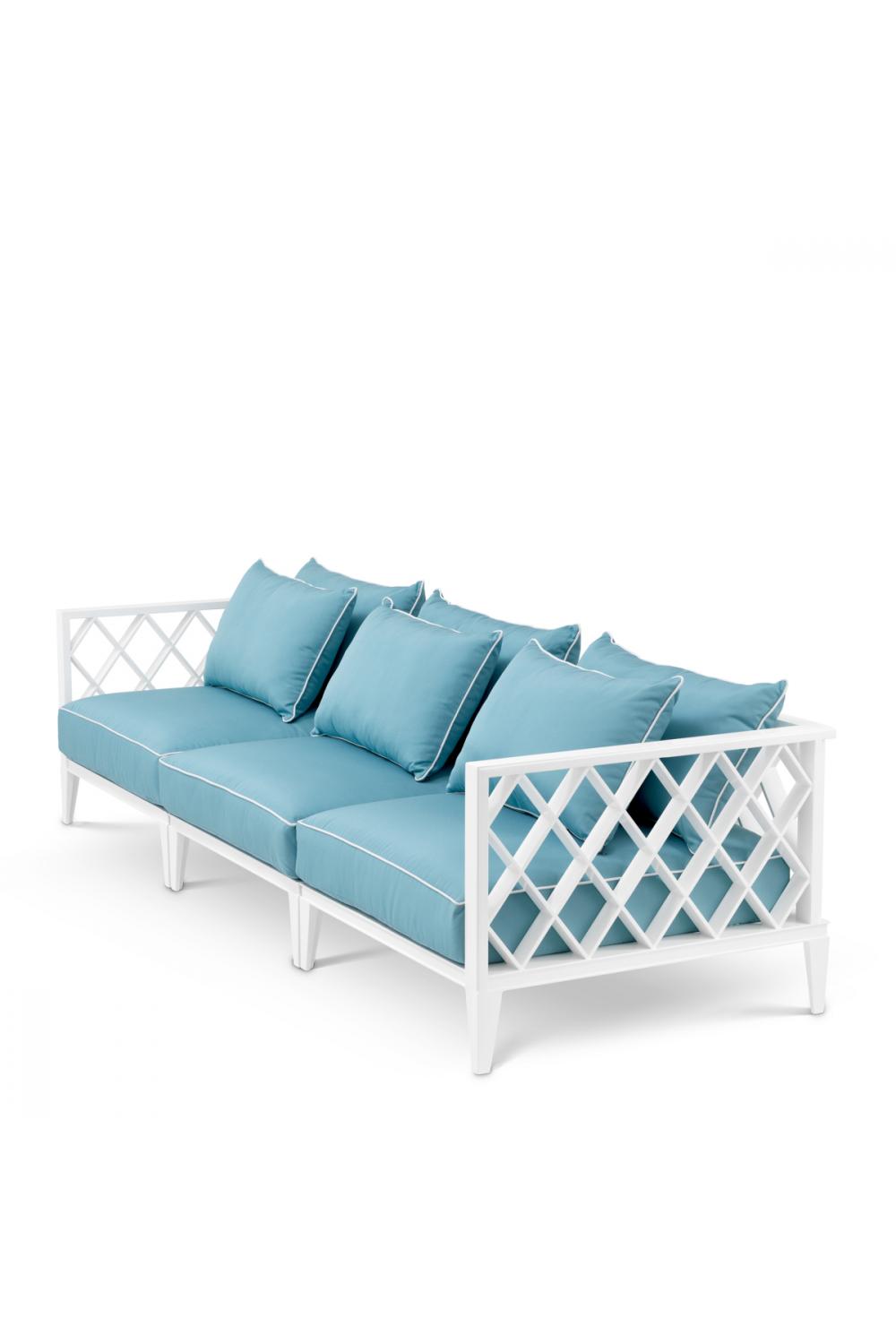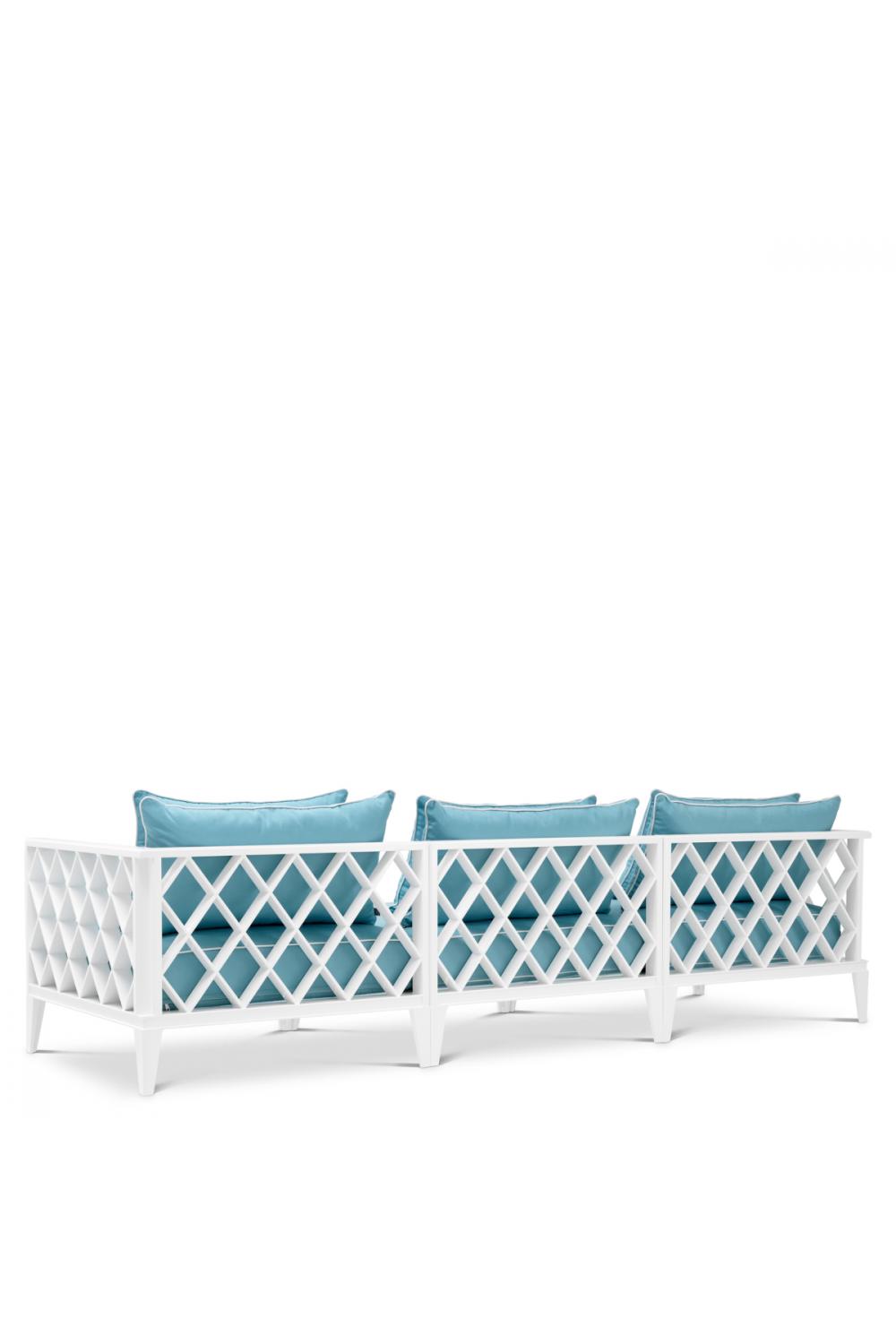 Each sofa features generous three-seater proportions and includes matching scatter cushions with contrast piping, lending a bespoke finish to your outdoor arrangement. The subtle matte frame, available in Green, White, or Black, complements diverse design palettes — from minimalist terraces to lush garden lounges.