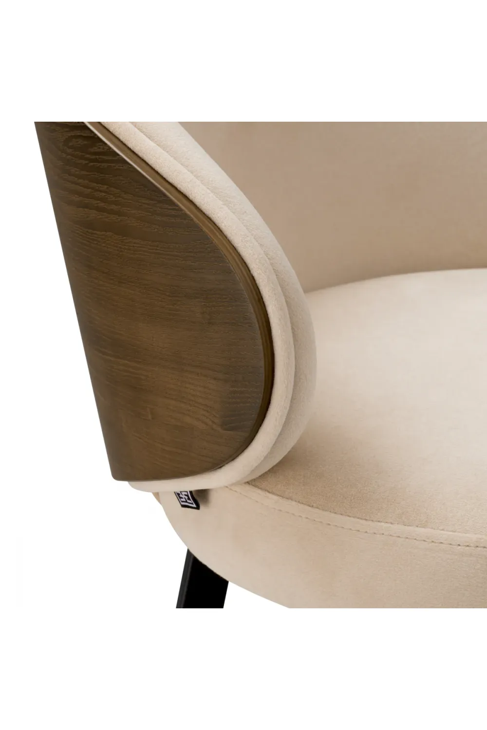 Elegant and contemporary, the Sabino Bar Stool combines comfort and sophistication. Featuring a soft beige fabric seat, a rich walnut curved backrest, and sleek black legs, it offers both luxury and durability for modern interiors.