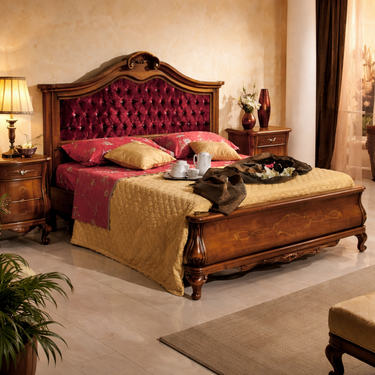 The warm chromatic richness of this bed — walnut wood, crimson red velvet, crystal buttons, and gold inlay — creates an interior atmosphere that demands surrounding furnishings of equal warmth, material depth, and decorative intentionality. Our collection of luxury nightstands includes carved solid wood pieces in warm walnut and cherry finishes whose grain character, bombe drawer fronts, and gold hardware detailing are ideally suited to complement a baroque wooden bed of this natural elegance and upholstered richness. A matching walnut finish nightstand with carved column details and gold hardware positioned either side of this frame would establish a bedroom ensemble of complete decorative coherence — a warm, jewelled European interior in which natural wood craftsmanship, velvet opulence, and gilded detail speak a single unified language of Italian Baroque luxury at its most richly resolved.