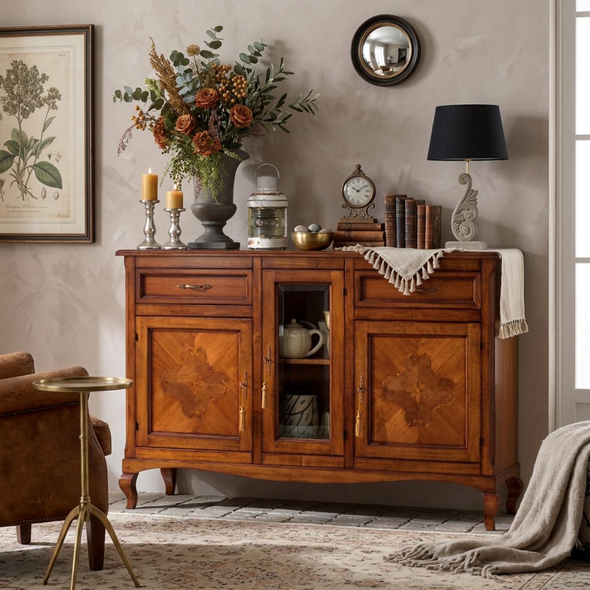 Elegant luxury sideboard crafted in warm wooden finish with decorative inlay storage panels and glass center cabinet. This baroque sideboard for living room interiors offers refined European craftsmanship with display and storage functionality.