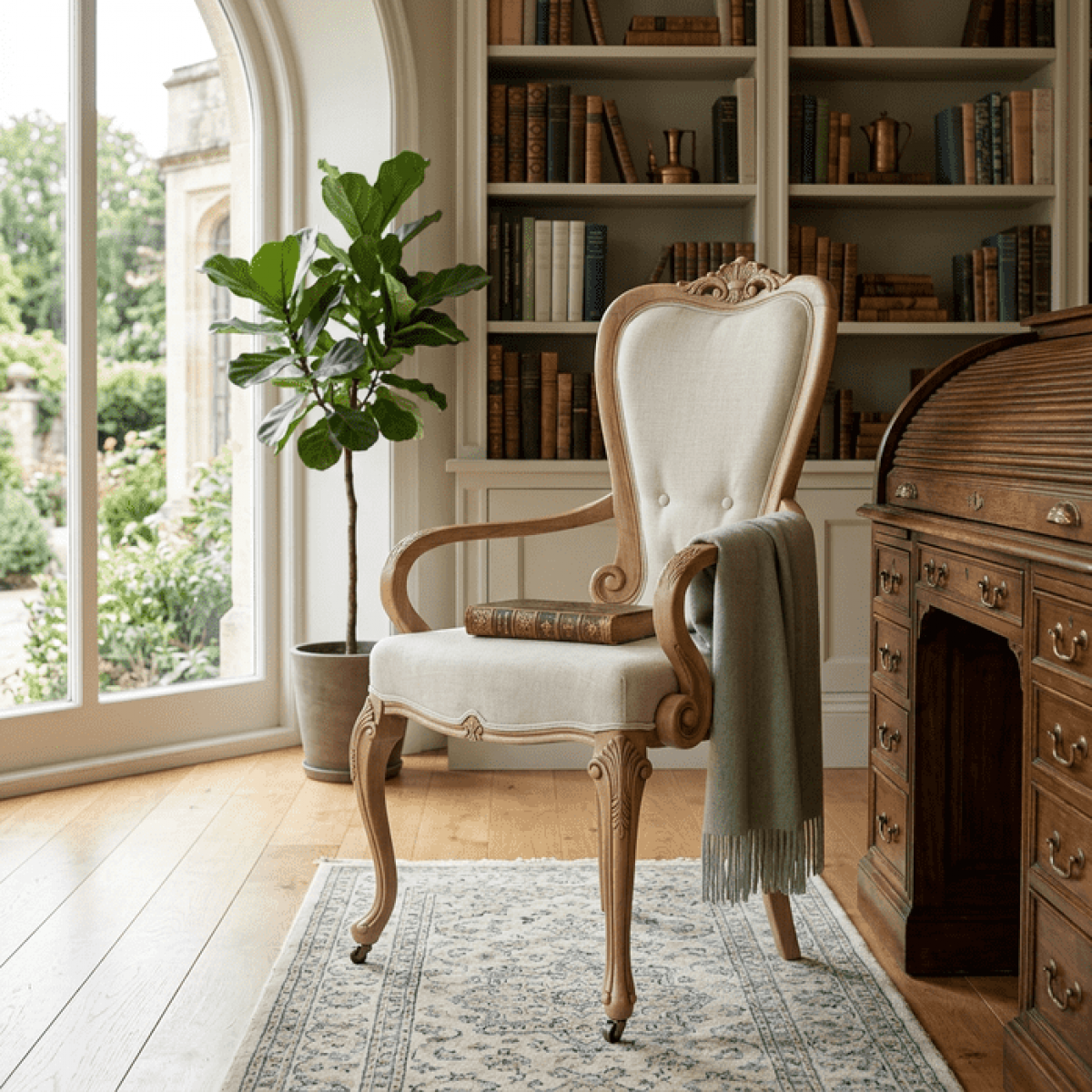 Luxury Carved Wooden Upholstered Dining Armchair with Cream Fabric & Scroll Arms embodies timeless European craftsmanship and refined elegance. These luxury upholstered dining armchairs feature a beautifully sculpted wooden frame with intricate carved detailing, complemented by a soft cream upholstered seat and backrest. The gracefully curved scroll armrests enhance comfort while adding a sophisticated decorative element. Designed with elegant cabriole legs and handcrafted detailing, these wooden dining armchairs bring classic luxury styling to upscale dining interiors and refined hospitality settings.