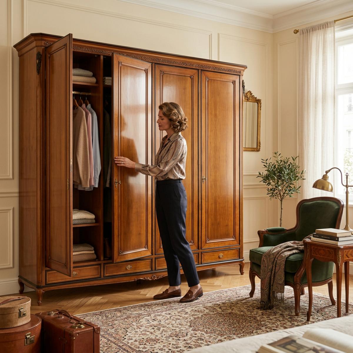Premium luxury wardrobe cabinet crafted in polished wood with multi-door panels and lower storage base. This baroque wardrobe cabinet blends classic elegance with spacious storage functionality.