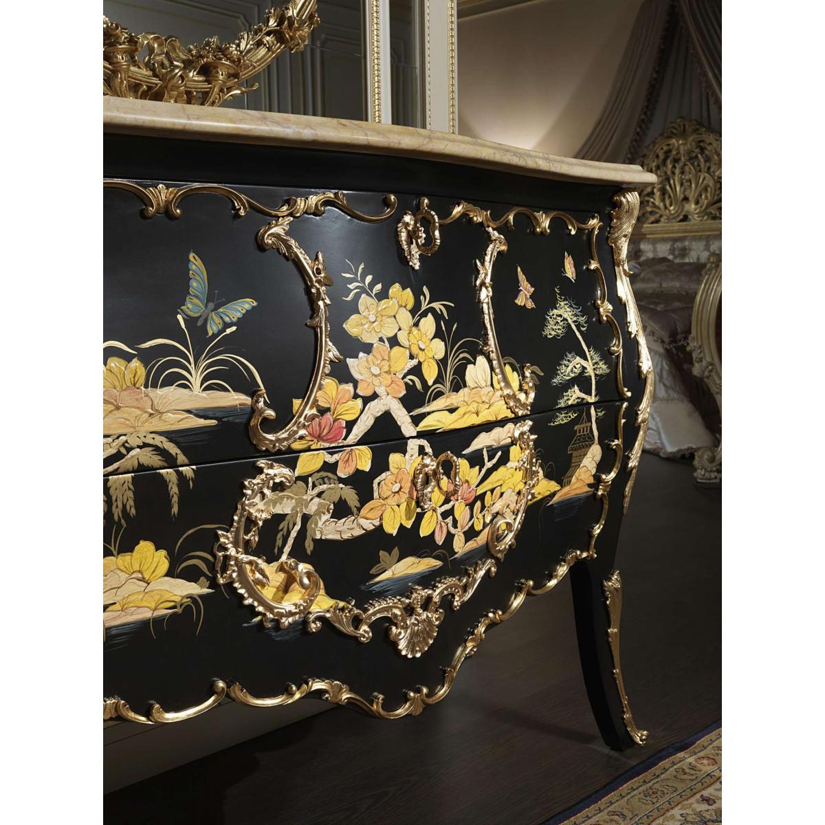 This elegant luxury chest of drawers features a black lacquered chinoiserie finish with ornate gold leaf detailing and Valencia cream marble top. Designed as a refined baroque chest of drawers, this royal chest of drawers enhances interiors with timeless European sophistication and practical 2-drawer storage.