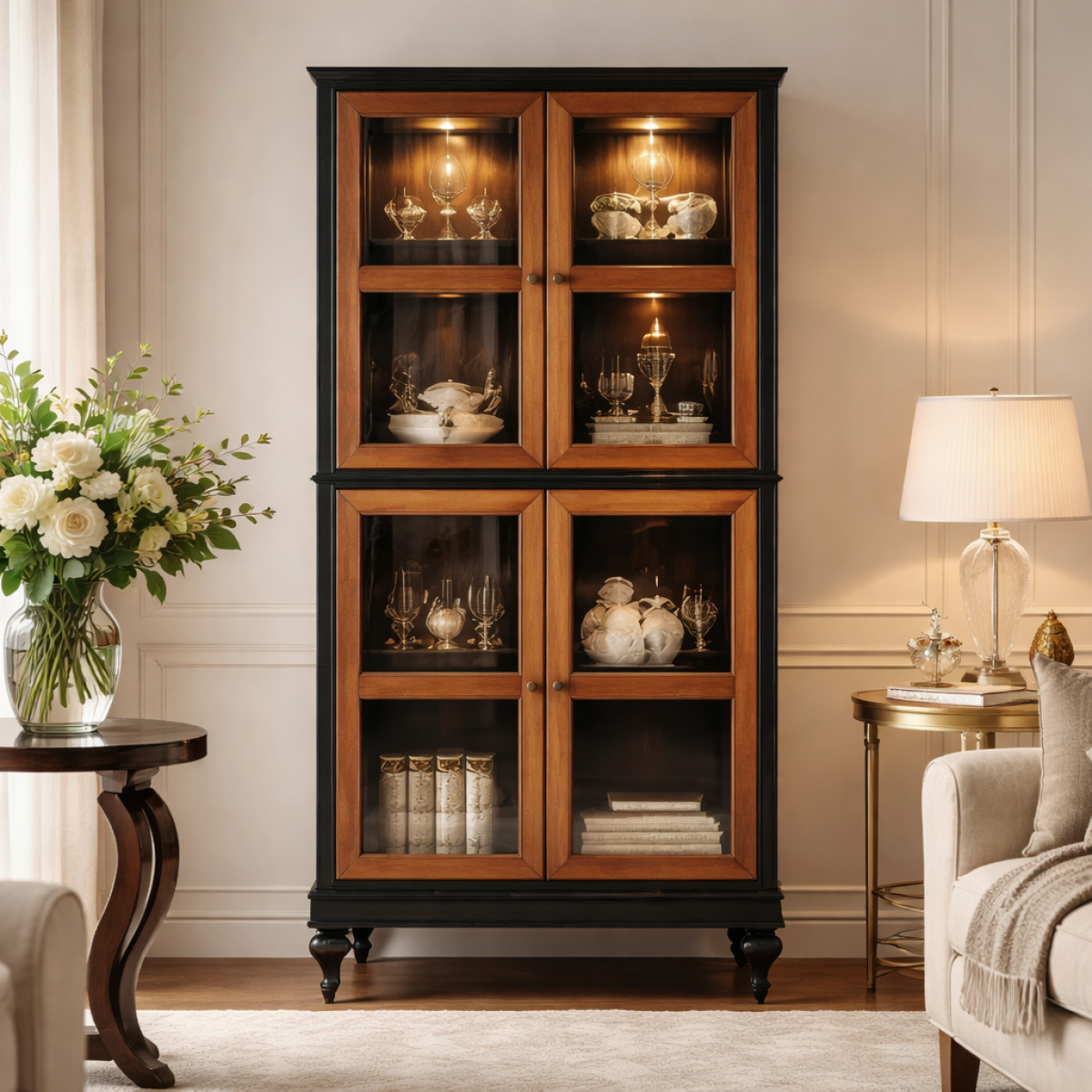 - Premium luxury display cabinet with bold black and wood contrast
