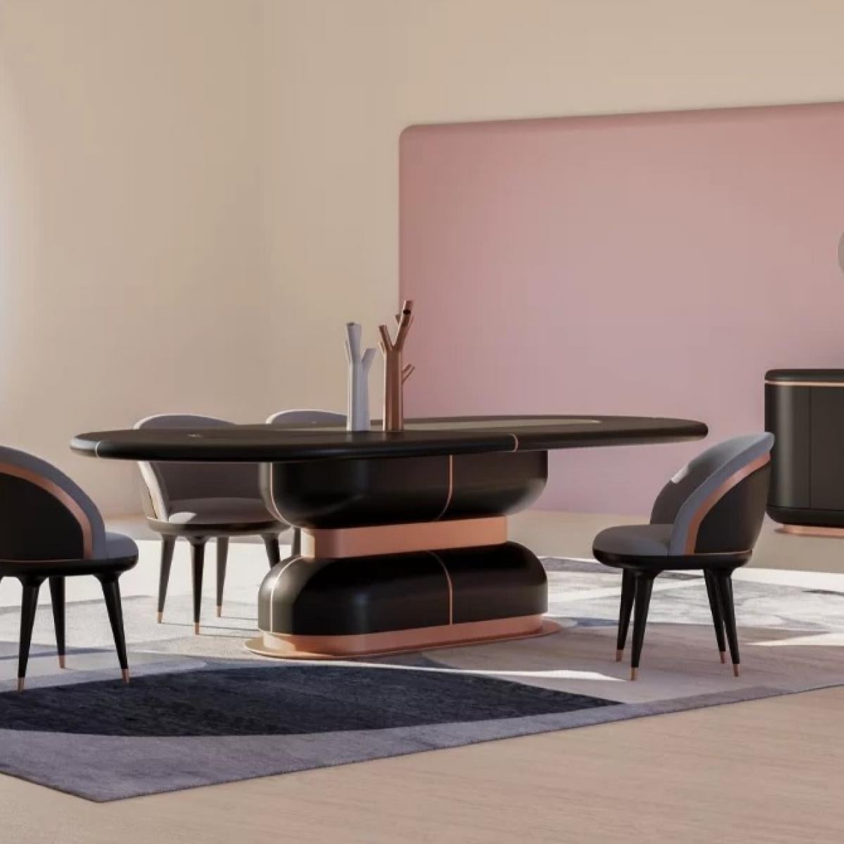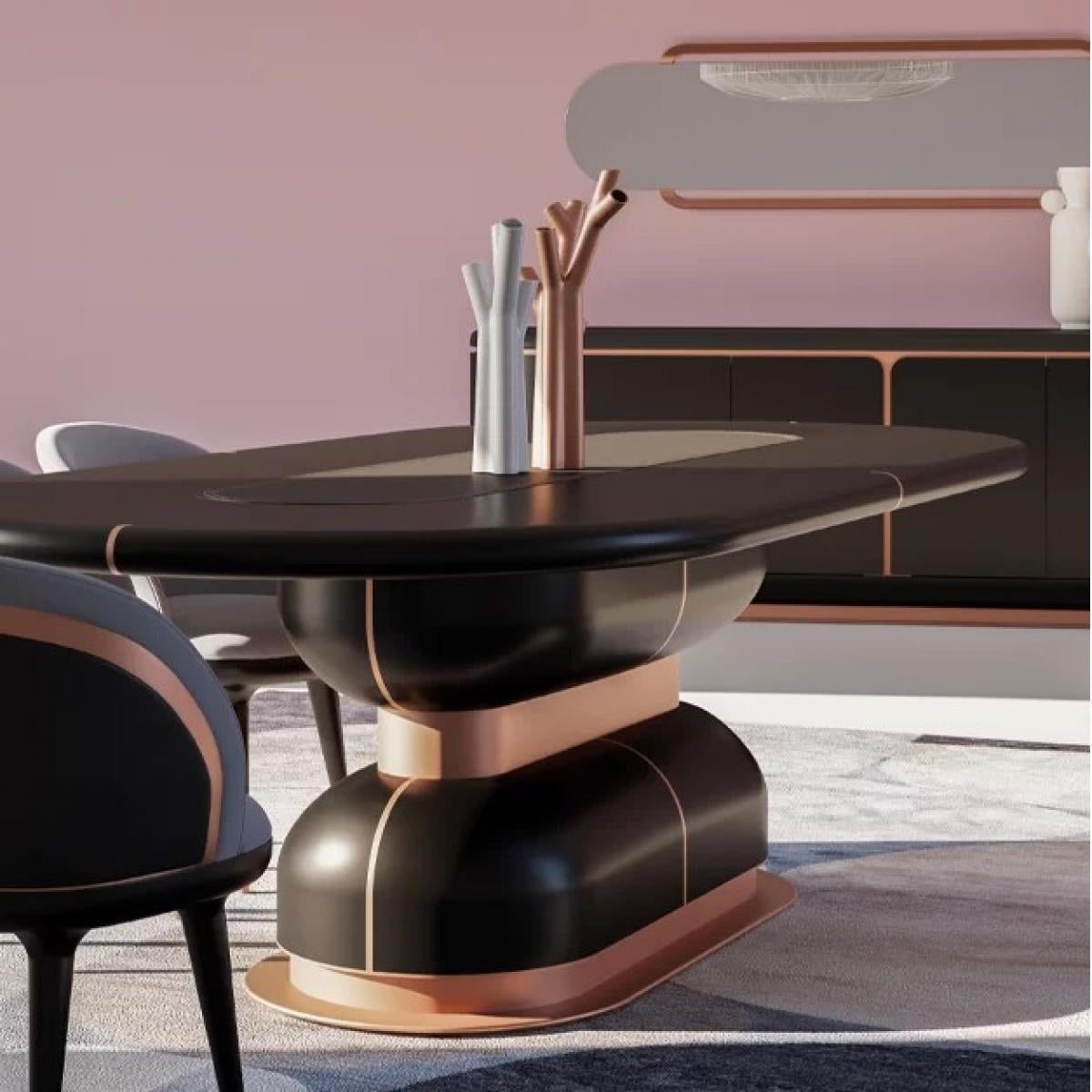 For a complete transformation, pair this stunning table with other luxury pieces like luxury coffee tables or luxury nightstands to create a cohesive and elegant look in your home. Transform your space into a refined sanctuary with this exquisite dining table, a true testament to modern design and craftsmanship. The table features a metal base with a copper finish and a high-quality matte black lacquered wood or composite tabletop, combining modern elegance and durability for luxury interiors. Explore our complete luxury dining table collection for more exquisite designs that bring elegance and sophistication to your dining space.