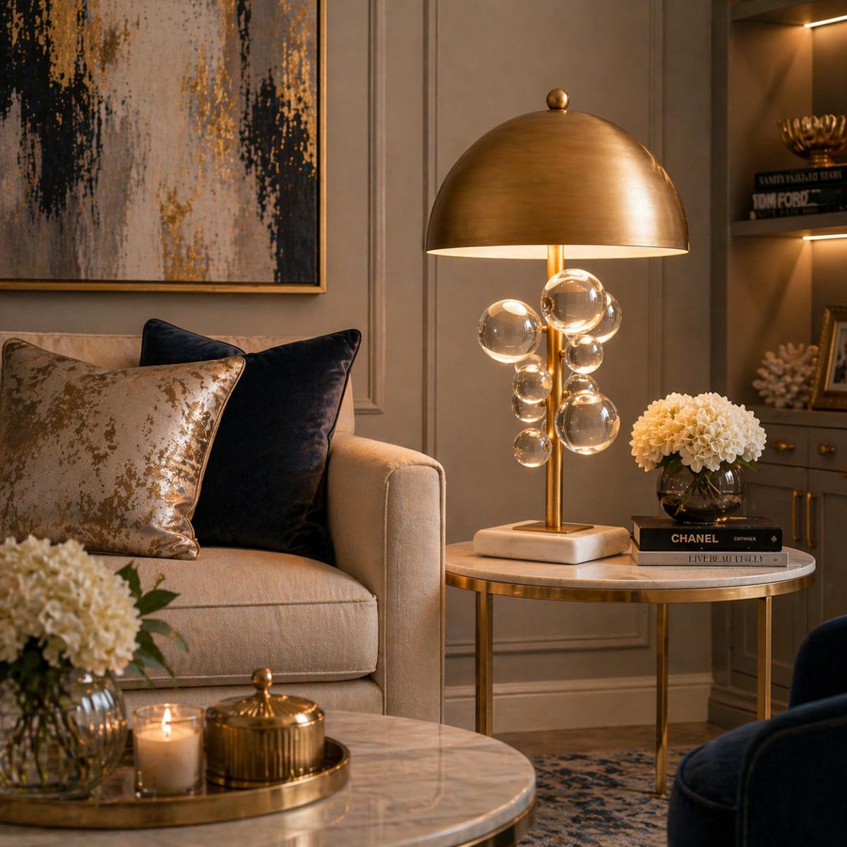 Designed for both atmosphere and visual interest, the clear glass balls come in different sizes for a playful, layered effect around the central stem. As light diffuses from the dome-shaped shade, it highlights the suspended bubble-like glass elements, adding depth and movement even when the lamp is simply sitting in place. The result is sophisticated style with an inviting glow—ideal when you want modern gold table lamp character without overwhelming the room. Antique brass finish details pair naturally with a crisp white marble base, making this contemporary lamp feel curated and cohesive. Elevate your décor with our luxury table lamp collections, where sculptural forms and soft ambient lighting bring depth, warmth, and timeless sophistication to your interiors.