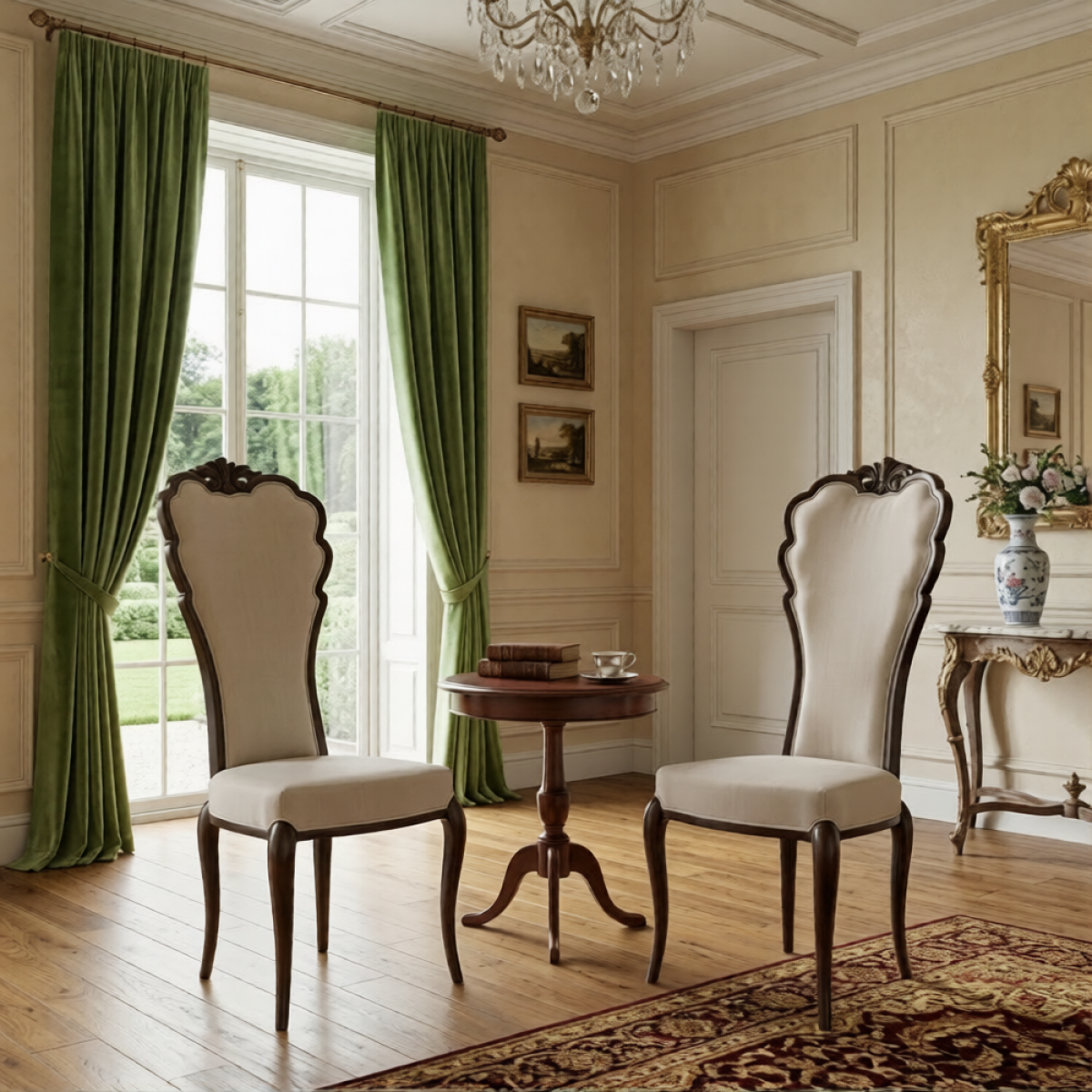 Elegant luxury upholstered dining chairs featuring a sculpted wooden frame, tall high-back design, and soft cream upholstery. These refined wooden dining chairs offer superior comfort and timeless sophistication, making them perfect luxury chairs for dining room interiors and luxury European dining spaces.