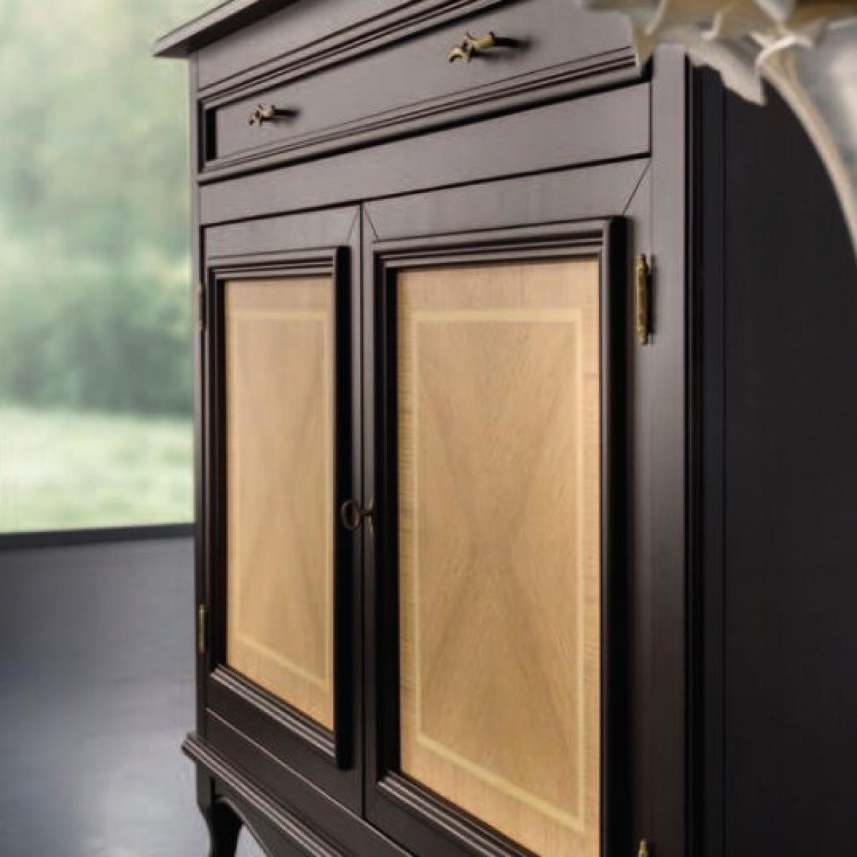 Das Barock-Sideboard wurde sowohl für Stil als auch Funktionalität entworfen und bietet eine geräumige obere Schublade sowie einen zweitürigen Schrank für übersichtliche Aufbewahrung. Die Türen mit Eichen-Fischgrätintarsien bringen Struktur und Wärme ins Design, während sie eine ausgewogene Symmetrie bewahren. Dieses Barock-Sideboard für das Wohnzimmer bietet praktischen Stauraum für Esszimmerutensilien, dekorative Accessoires und Alltagsgegenstände und hebt gleichzeitig die Atmosphäre anspruchsvoller Interieurs hervor.
