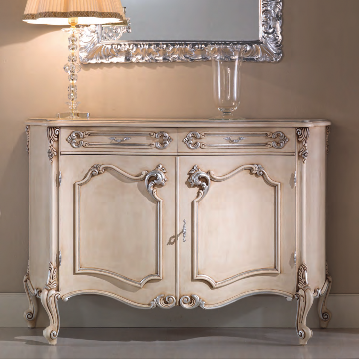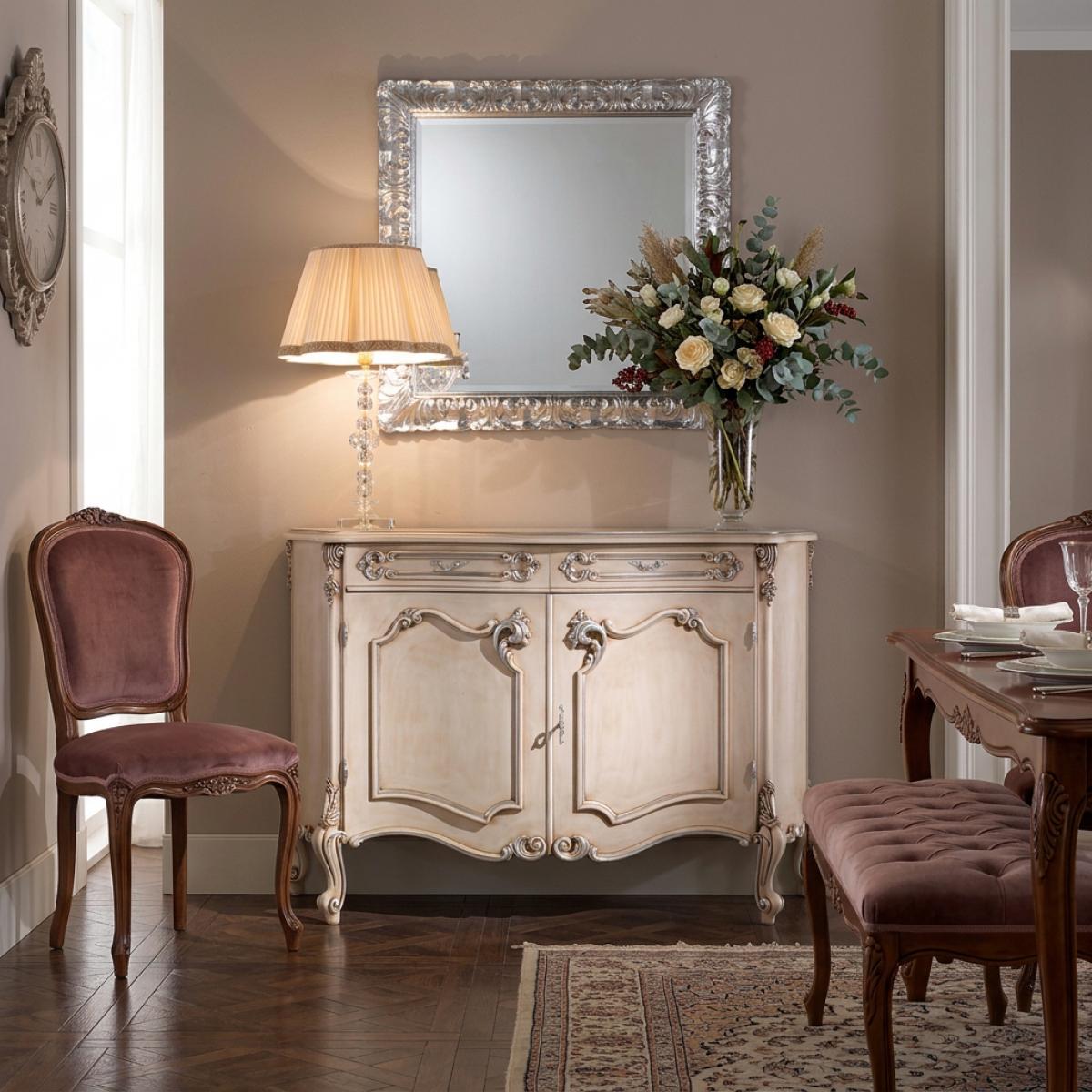 Kombinieren Sie dieses elegante Möbelstück mit unseren luxuriösen barocken Spiegeln, um eine harmonische und optisch beeindruckende Atmosphäre zu schaffen. Ein dekorativer Spiegel verstärkt die Präsenz dieses barocken Sideboards, sorgt für mehr Tiefe, Helligkeit und architektonische Eleganz. Diese Kombination hebt die Ästhetik von Luxus-Sideboards für das Wohnzimmer hervor und verwandelt Ihren Raum in ein stilvolles, von Europa inspiriertes Ambiente.