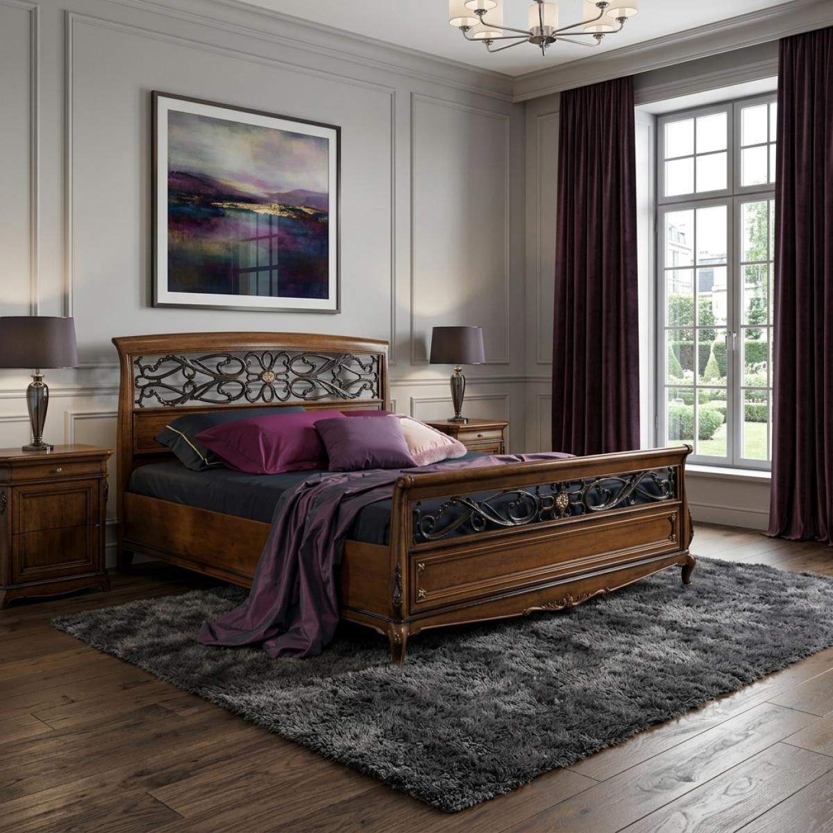 Barockes Luxus-Holzbett mit dekorativem schwarzem Schnörkel-Kopf- und Fußteil ist ein anspruchsvolles Luxusbett, das klassische europäische Interieurs stilvoll bereichert. Der polierte Holzrahmen zeigt elegante barocke Schwünge, die durch filigrane schwarze Schnörkelverzierungen am Kopf- und Fußteil ergänzt werden. Die skulpturale Struktur und die anmutige Silhouette unterstreichen traditionelle Handwerkskunst, während die warme Holzoberfläche dem Raum eine edle und behagliche Atmosphäre verleiht. Dieses barocke Bett setzt einen zeitlosen Akzent in anspruchsvollen Schlafzimmerumgebungen.