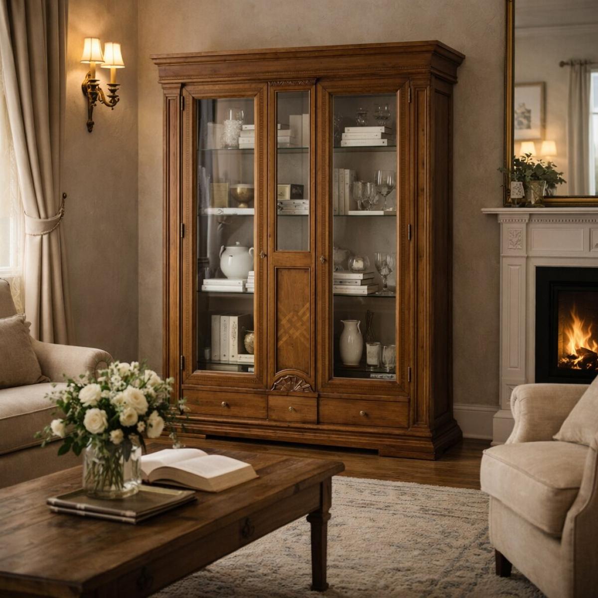 Der Schrank wurde sowohl für Funktionalität als auch für Eleganz entworfen und bietet großzügige Glasregale im Inneren für eine organisierte Präsentation. Die unteren Schubladen sorgen für zusätzlichen Stauraum für kleinere Accessoires, während das zentrale geometrische Intarsien-Element visuelles Gleichgewicht und architektonischen Charme schafft. Dieser barocke Vitrinenschrank für das Wohnzimmer fungiert als edler Blickfang, der klassische Handwerkskunst mit praktischem Stauraum verbindet.