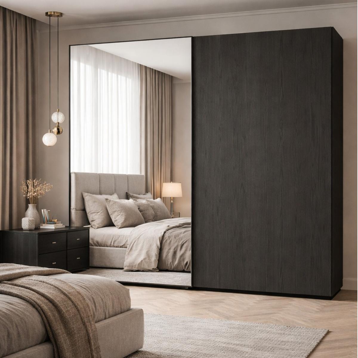 Dieser schwarze Luxus-Schrank bietet ein elegantes modernes Design mit großem Spiegel, perfekt für luxuriöse Schlafzimmermöbel. Die kontrastierenden Farben verleihen jedem Schlafzimmerraum Raffinesse und Stil. Ideal, um Essentials auf schicke, zeitgemäße Weise zu organisieren.