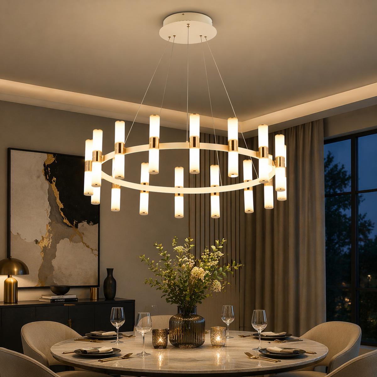 Setzen Sie mit diesem Luxus-Kronleuchter ein architektonisch anspruchsvolles Statement in Ihrem Raum, das durch seine skulpturale, runde Silhouette besticht. Der Kronleuchter verbindet ein klares, modernes Deckenmontagedesign mit einer warmen, symmetrischen Präsenz, die sowohl alltägliche Räume als auch besondere Anlässe stilvoll aufwertet. Im Zentrum steht ein eleganter Ringrahmen, der gleichmäßig verteilte, nach unten gerichtete zylindrische Kerzenlampen trägt. So entsteht ein offenes, ausgewogenes Erscheinungsbild, das im Raum leicht wirkt und dennoch einen eindrucksvollen Blickfang bietet. Die runde Deckenrosette rundet das Design mit einem klaren, zeitgemäßen Finish ab, sodass die Konstruktion aus jedem Blickwinkel bewusst und harmonisch erscheint. Die goldene Beschichtung verleiht dem Gesamtbild eine edle Wärme – ideal, um in modernen Essbereichen, anspruchsvollen Wohnzimmern oder als repräsentative Eingangsbeleuchtung eine luxuriöse Atmosphäre zu schaffen.