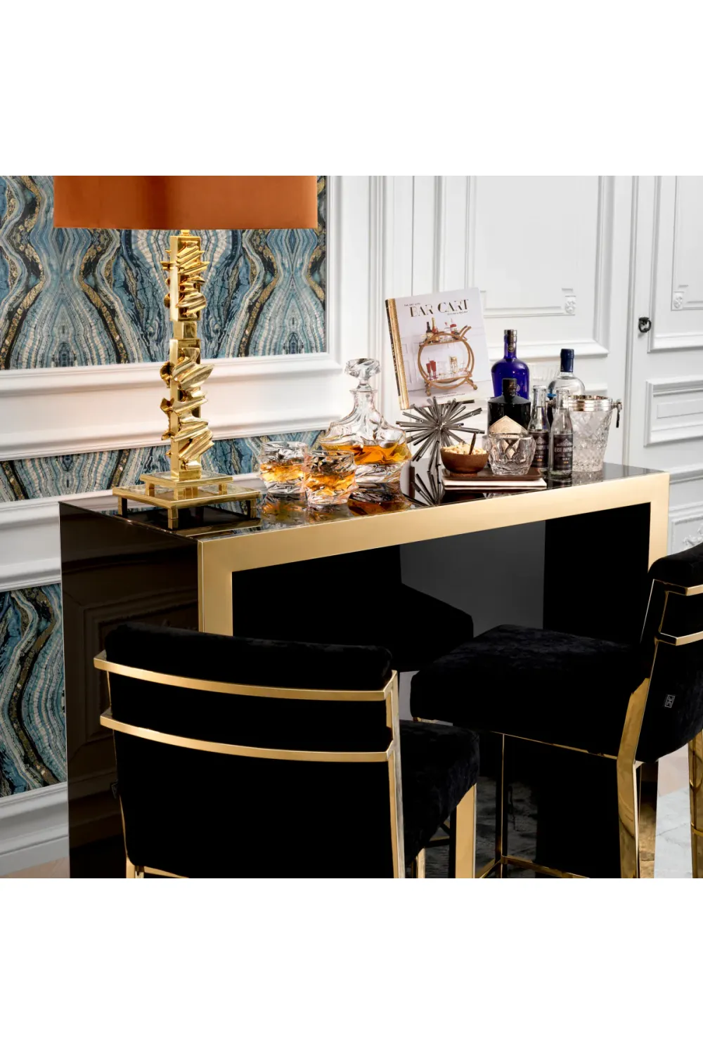 Die Grimaldi Bar wurde mit Blick auf die Gastfreundschaft entworfen und verbindet moderne Designästhetik mit hochwertiger Handwerkskunst. Die glänzende schwarze Glasoberfläche reflektiert das Licht wunderschön und verleiht jedem Interieur Tiefe und Dramatik, während der goldfarbene Rahmen einen Hauch von Opulenz und Wärme verströmt.