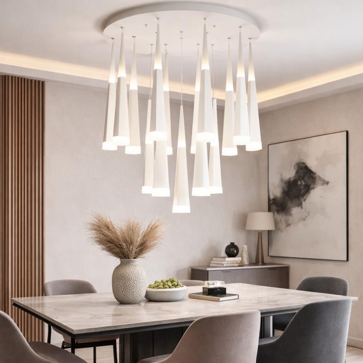 Der LED Acryl Weiß Hängende Mehrfach-Pendelleuchten Moderner Luxus Kronleuchter bringt einen edlen, wirkungsvollen Akzent in zeitgenössische Innenräume und verbindet klare Geometrie mit sanfter Lichtstreuung. Als Luxus Kronleuchter ist er so gestaltet, dass er architektonisch wirkt und nicht klobig, mit einer glatten Deckenrosette und einer ausgewogenen Anordnung mehrerer hängender Elemente. Die klare weiße Optik schafft eine helle, moderne Präsenz, die alltägliche Räume aufwertet, ohne sie zu dominieren. Mattiertes Acryl mildert das Licht, sodass der Schein gleichmäßig und angenehm wirkt – ideal für einladende Räume und stilvolle Essbereiche. Aus verschiedenen Blickwinkeln erzeugt der abgestimmte Abstand der Elemente eine ruhige Rhythmik über dem Kopf und betont die Deckenlinie mit einer zurückhaltenden Aussage.