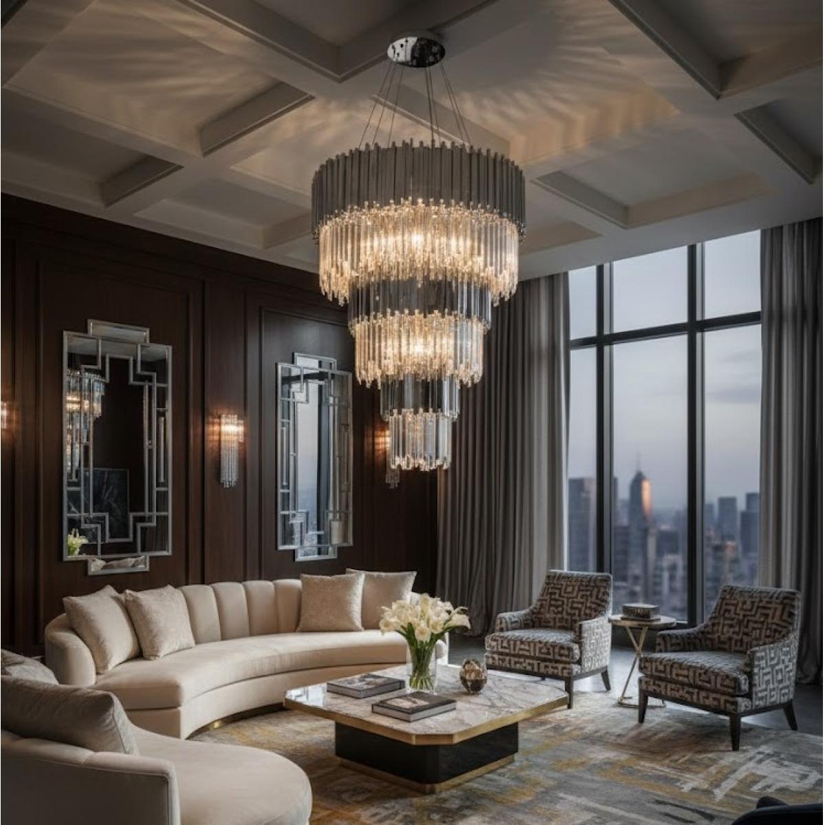 Der Luxuriöse 6-stufige silberne moderne Kristall-Kronleuchter bietet Größe, Brillanz und architektonisches Drama und ist ideal für luxuriöse Residenzen und Boutique-Hospitality-Settings. Seine polierte silberne Oberfläche harmoniert perfekt mit Marmoroberflächen, verspiegelten Paneelen und edlen Polstermöbeln. Für ein stimmiges Designstatement entdecken Sie weitere Stücke aus unserer Luxus-Kronleuchter-Reihe. Designer, die Premium-Projekte ausstatten, können diese Beleuchtung auch mit unserer exklusiven Luxus-Hotelmöbel-Kollektion kombinieren. Für eine stimmige und gehobene Lichtkomposition entdecken Sie unseren gestuften LED Art Deco Silber Kristall-Kronleuchter, der dieselbe kaskadierende Brillanz und zeitgenössische architektonische Eleganz widerspiegelt.