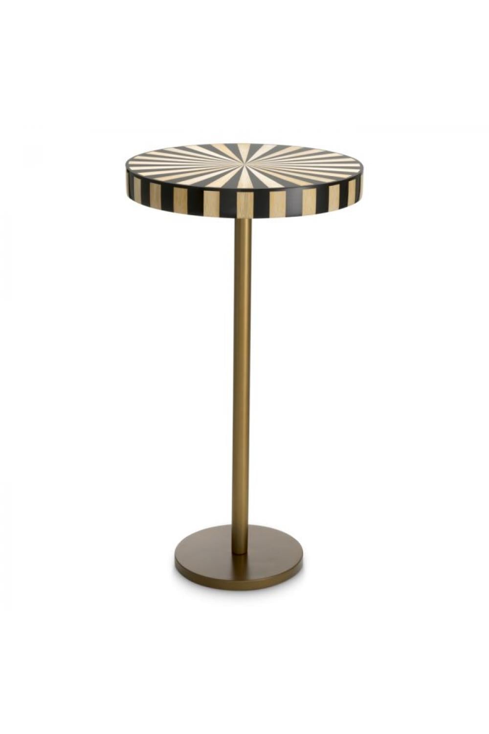 Dieser luxuriöse runde Beistelltisch in Antikmessing-Finish verbindet zeitlose Handwerkskunst mit moderner Ästhetik. Das Gestell ist in luxuriösem Antikmessing ausgeführt, das jedem Raum Tiefe und Wärme verleiht. Die Tischplatte ist mit einem raffinierten Strohintarsien-Design verziert, das mit einer Hochglanzlackierung vervollständigt wird, die die komplizierten Muster und die luxuriöse Anziehungskraft hervorhebt. Die glatte, runde Tischplatte bietet eine elegante Oberfläche für dekorative Objekte, Bücher oder eine Lampe, während die kompakte Form ihn vielseitig für jeden Raum macht.