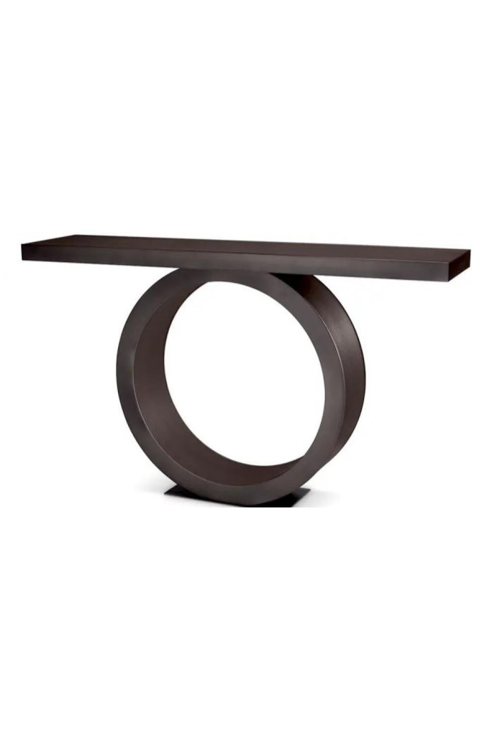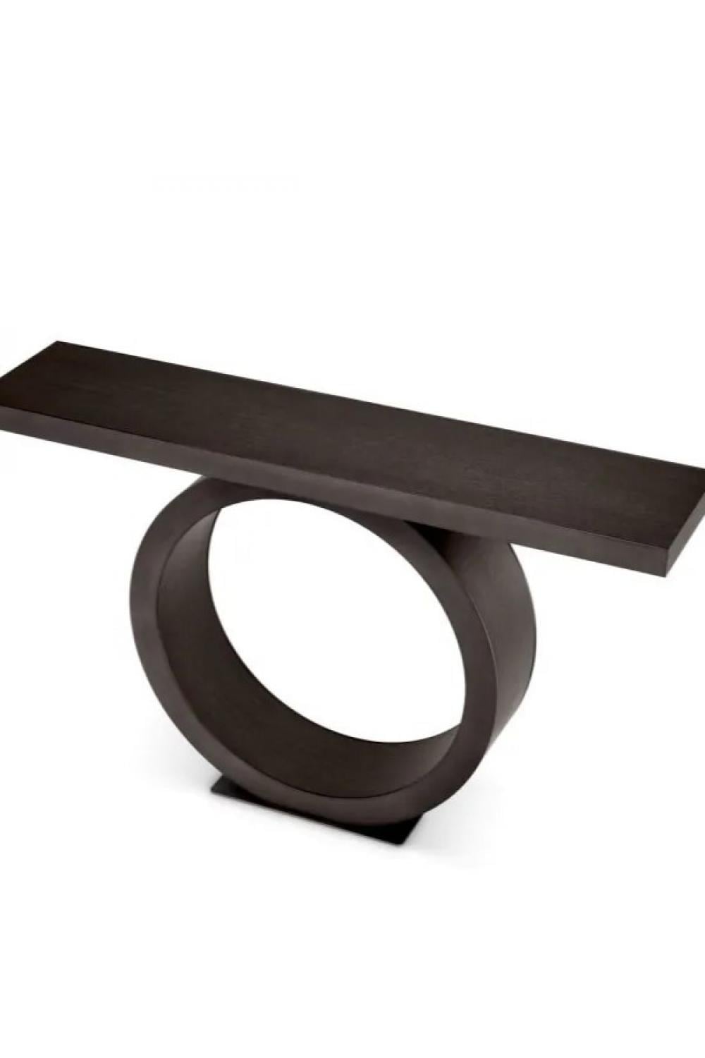 Dieser rechteckige Tisch mit kreisförmigem Sockel in Antikbronze-Finish zeichnet sich durch eine Platte aus mokkafarbenem Eichenfurnier und eine markante Struktur in Bronze-Finish aus. Der luxuriöse Konsolentisch verbindet moderne Geometrie mit handwerklichen Details. Der kreisförmige Sockel sorgt für visuellen Rhythmus und architektonisches Interesse. Die warmen Holztöne verleihen ihm Tiefe und Raffinesse. Ein Statement in Bronze-Finish für elegante europäische Innenräume.
