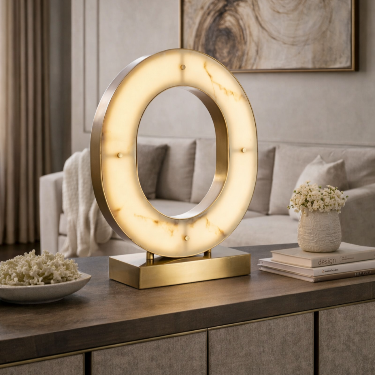 Ob als skulpturaler Akzent auf dem Schreibtisch oder als elegante LED-Ringleuchte für den Nachttisch, diese Tischleuchte aus Alabaster und Messing bietet sowohl Funktionalität als auch Kunstfertigkeit. Ihr stimmungsvolles Licht schafft eine beruhigende Umgebung, die sich ideal für intime Abende oder Boutiquen eignet. Kombinieren Sie sie mit abgestimmtem Dekor für einen kohärenten Look und vervollständigen Sie Ihr Interieur-Ensemble mit einer luxuriösen Kommode. Entdecken Sie zeitlose Kreationen von Luxury Group International und erkunden Sie unsere kuratierte Auswahl an luxuriösen Hotelmöbeln für distinguierte Räume.