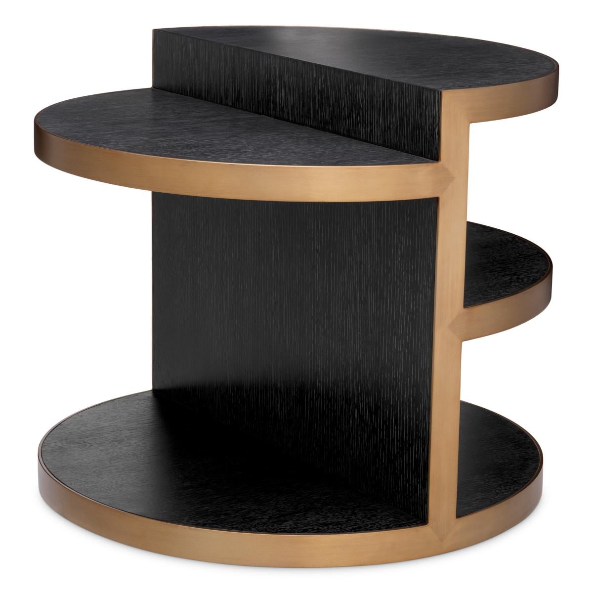 Der Luxury Art Deco Beistelltisch aus grauem Eichenfurnier mit gebürstetem Messing-Finish vereint eine dramatische Eichenstruktur mit strahlenden Messing-Details. Ein raffinierter Luxus-Beistelltisch mit architektonischer Präsenz und zeitloser europäischer Eleganz. Skulpturales, sichelförmiges Design auf 3 Ebenen mit kühnem Schwarz-Gold-Kontrast. Exklusiv präsentiert von Luxury Group International für vornehme europäische Residenzen.