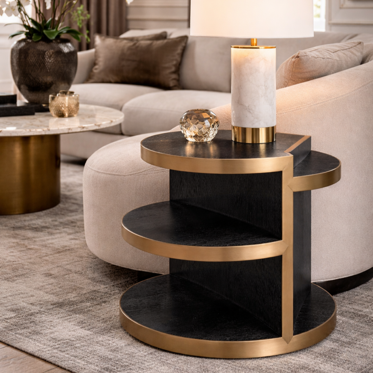 • moderner 3-stufiger halbmondförmiger Beistelltisch, geeignet für kuratierte Luxusinterieurs