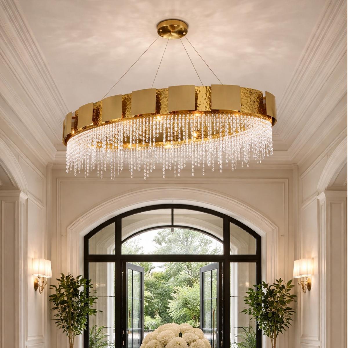 Luxuriöser Kristallkronleuchter im Art-Déco-Stil mit goldener Oberfläche und ovalem Querschnitt, der zeitlose Eleganz mit modernem Design verbindet. Mit seinen kaskadenartig herabfallenden Kristallen und dem gehämmerten goldenen Metallrahmen verleiht dieser Kronleuchter jedem Raum einen glamourösen Touch, ideal für Esszimmer, Kücheninseln und große Foyers.