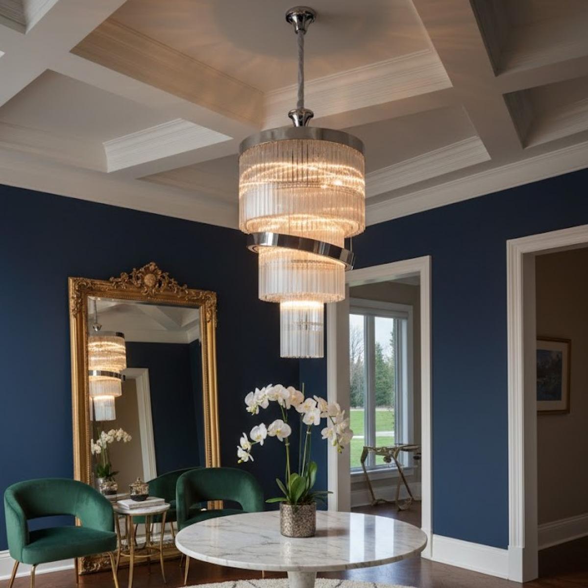 Der Luxuriöse gestufte Kristall-Kronleuchter aus Glasstäben mit spiralförmigem Chrom definiert architektonische Beleuchtung mit einer dramatischen, kaskadenförmigen Silhouette neu. Bestehend aus konzentrischen Ebenen präzise geschnittener Glasstäbe, erzeugt dieses skulpturale Leuchtobjekt einen leuchtenden Wasserfalleffekt. Das polierte Chrom-Spiralband umschlingt elegant das Zentrum, durchbricht die vertikale Symmetrie und setzt ein mutiges Designer-Statement. Mit 19 E14-Lichtquellen, ergänzt durch integrierte LED-Streifenbeleuchtung, sorgt dieser Luxuriöse gestufte Kristall-Kronleuchter aus Glasstäben mit spiralförmigem Chrom für eine brillante, gleichmäßig verteilte Beleuchtung. Die Kristallröhren streuen das Licht wunderschön und bieten einen glamourösen Schimmer, ideal für anspruchsvolle europäische Innenräume.