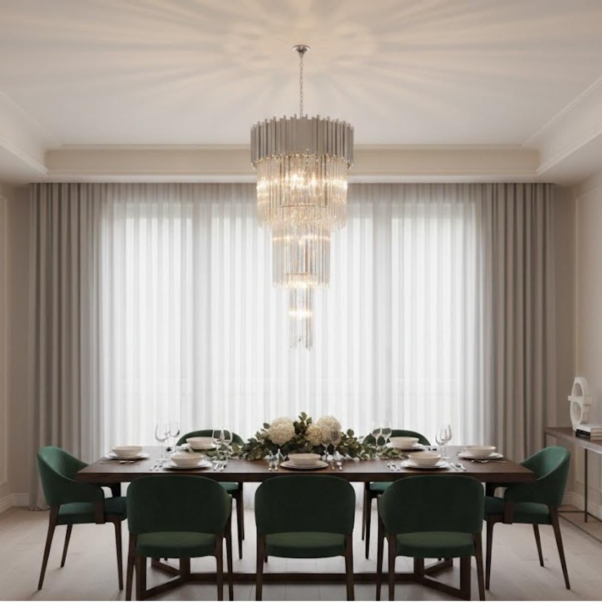 Ob in einer luxuriösen Hotellobby, einem Penthouse-Treppenhaus oder einem formellen Speisesaal, dieser moderne Kaskaden-Kronleuchter zieht die Aufmerksamkeit auf sich, ohne zu übertreiben. Seine theatralische Präsenz verwandelt jeden Raum in eine opulente Umgebung aus Licht und Struktur. Kombinieren Sie dieses Meisterwerk mit anderen Leuchten aus unserer exklusiven Luxus-Kronleuchter-Kollektion, um ein vollständig harmonisches Beleuchtungskonzept zu erreichen. Für zeitgenössische Symmetrie und langgestreckte Essbereiche entdecken Sie unseren eleganten linearen Kristall-Kronleuchter, der architektonische Räume mit raffinierter horizontaler Brillanz ergänzt. Verbessern Sie Ihr Beleuchtungskonzept mit Akzenten aus unserer exklusiven Luxus-Beistelltisch-Kollektion, die Ausgewogenheit, Textur und raffinierte europäische Eleganz in Ihr Interieur bringen soll.