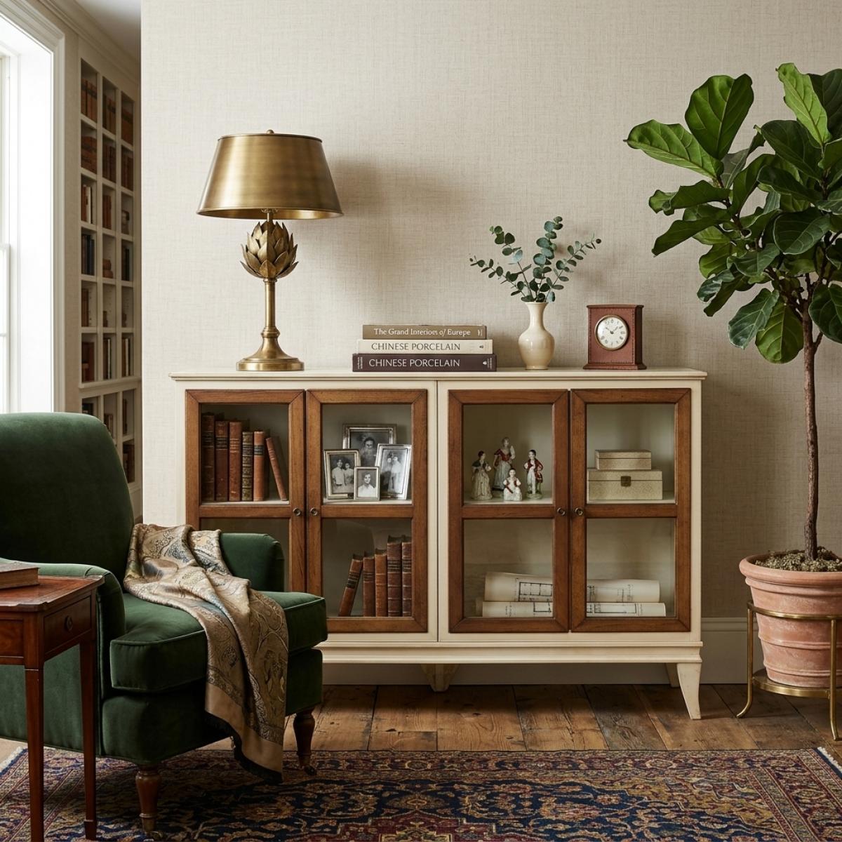- Premium Luxus-Sideboard mit Elfenbein-Finish und holzgerahmten Glastüren