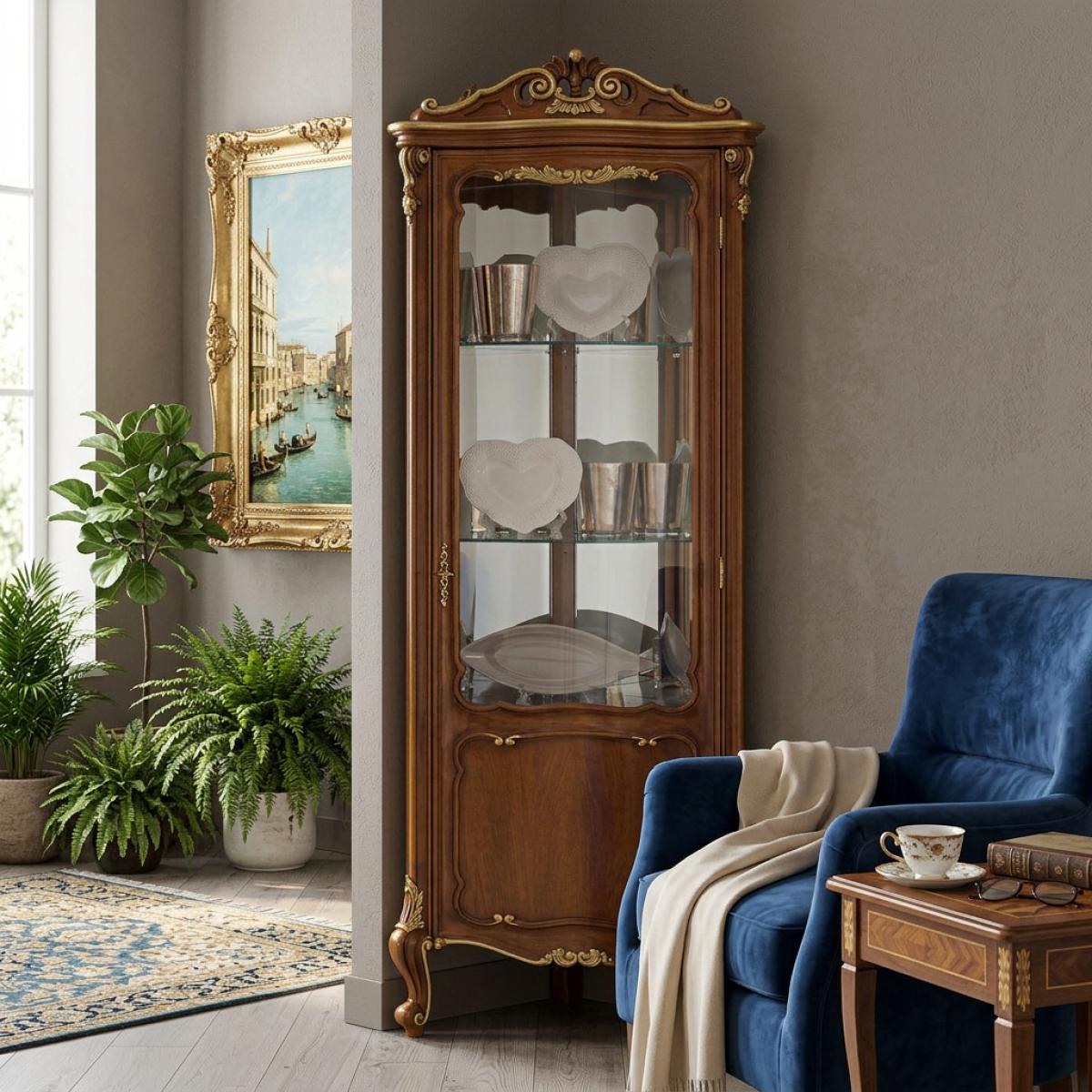 Luxuriöser barocker Eck-Vitrinenschrank aus Holz mit einer einzelnen Glastür und goldenen Akzenten – Wohnzimmermöbel von Luxury Group International