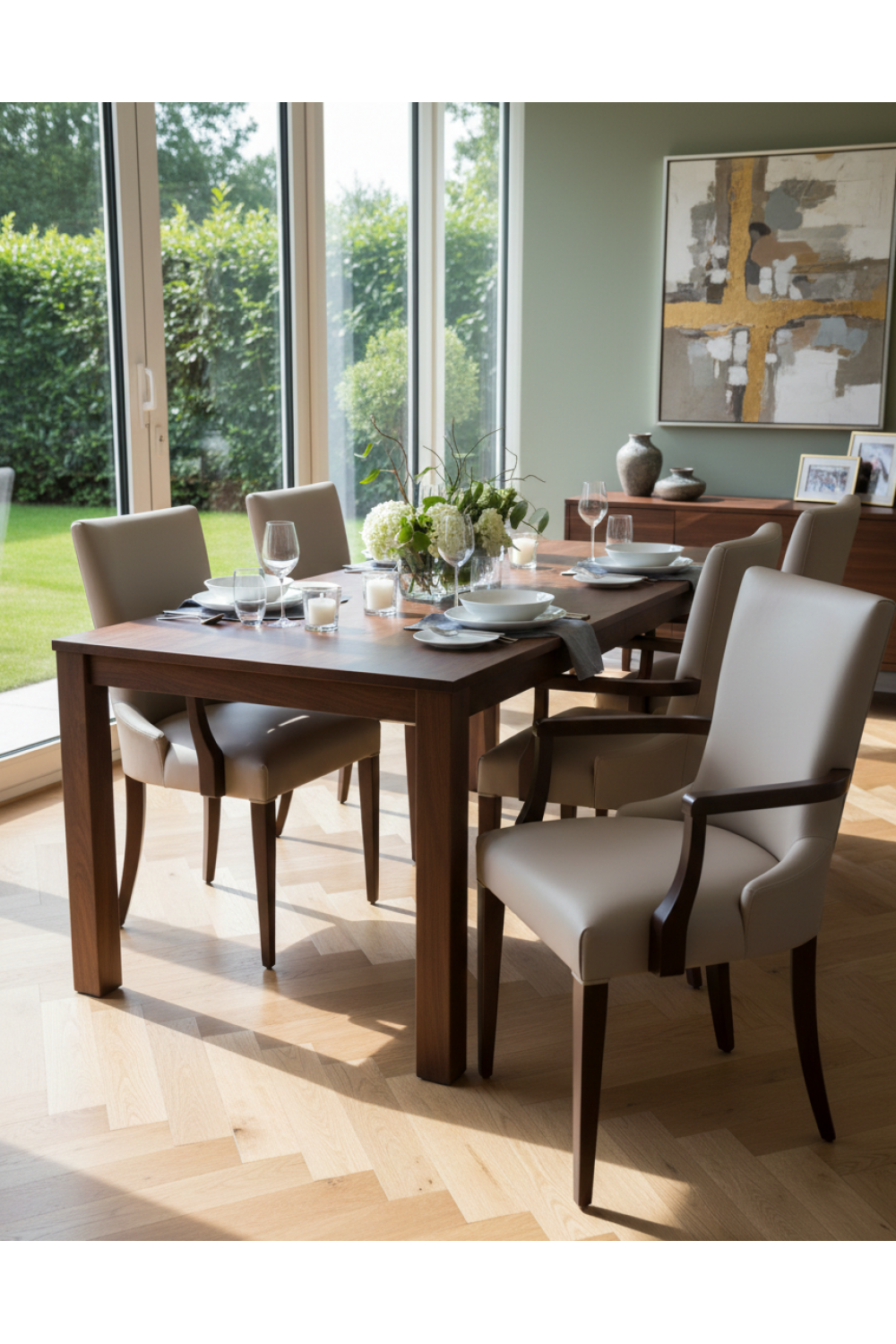 • Neutrale beigefarbene Polsterung fügt sich nahtlos in jedes Esszimmerdekor ein
