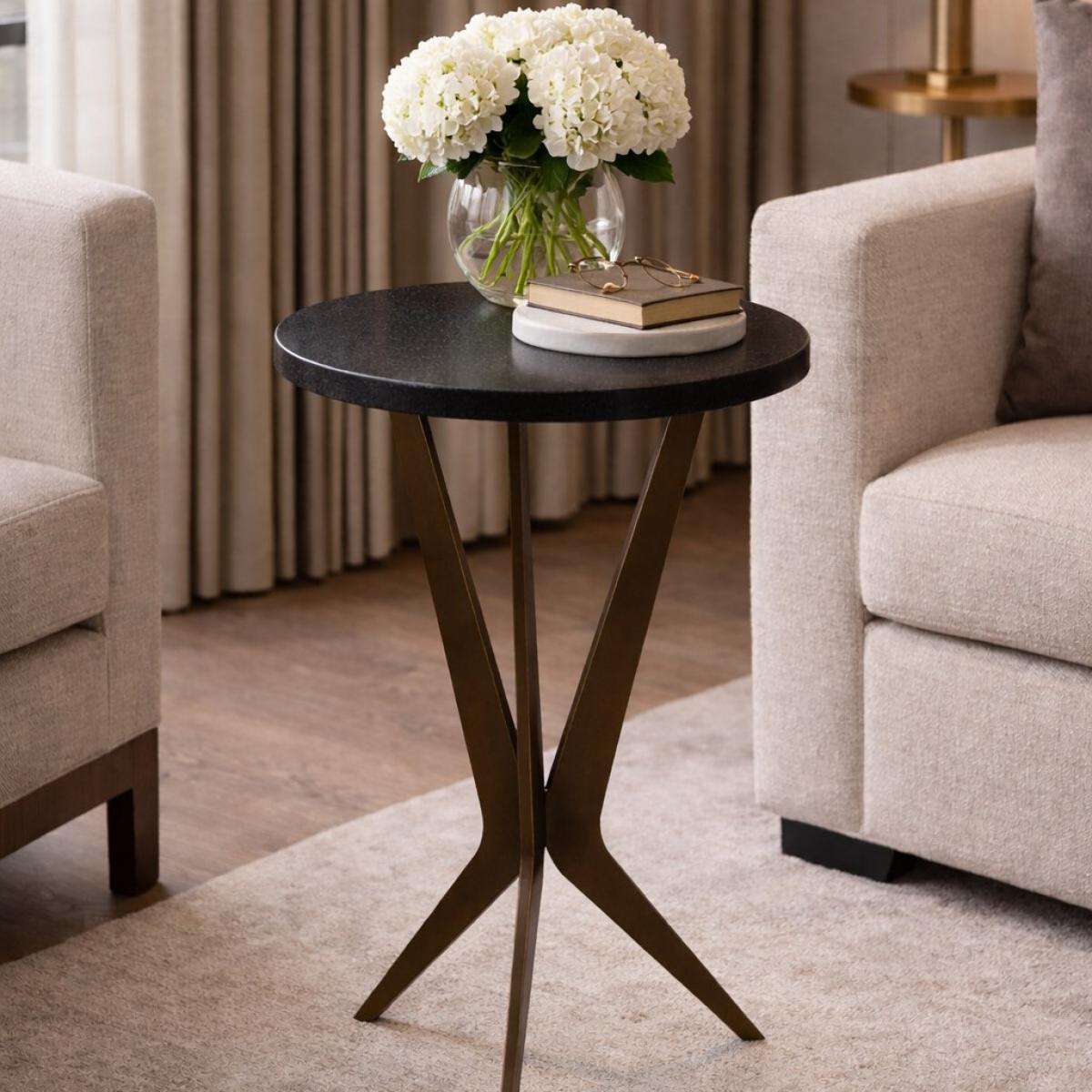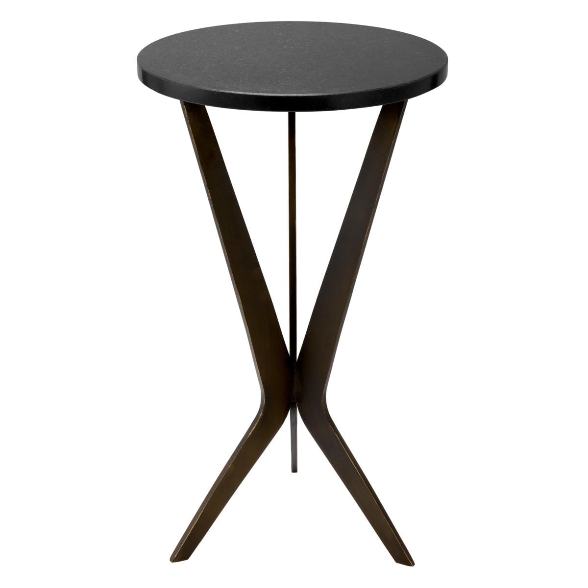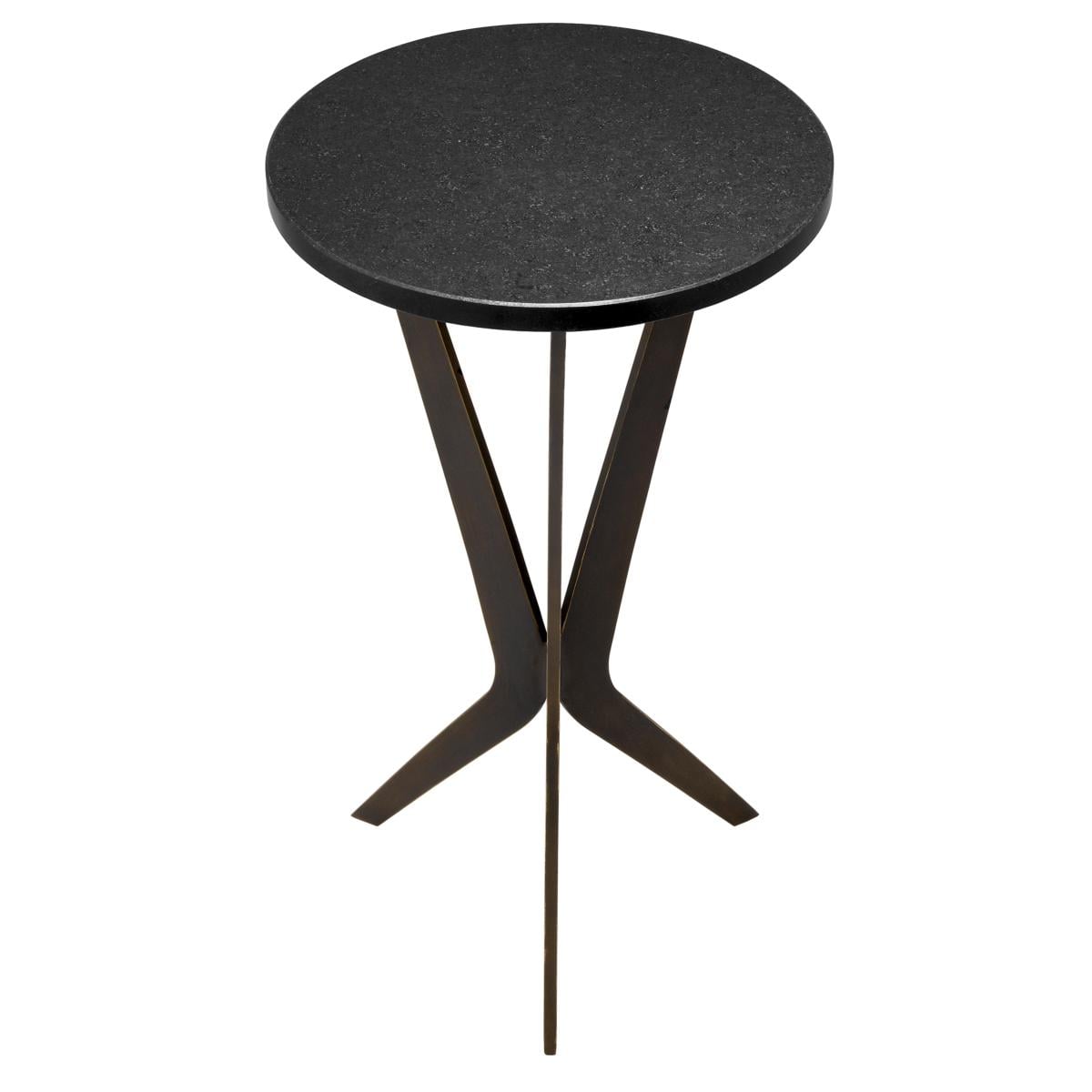 Der luxuriöse Beistelltisch mit rundem Granitplatte und Bronze-Finish auf dreibeinigem Gestell hebt moderne Innenräume hervor. Ein raffinierter Luxus-Beistelltisch mit kompakten, runden Proportionen. Schwarze Granitplatte kombiniert mit einem dreibeinigen Gestell in Bronze-Finish. Architektonisch, ausgewogen und mühelos elegant.