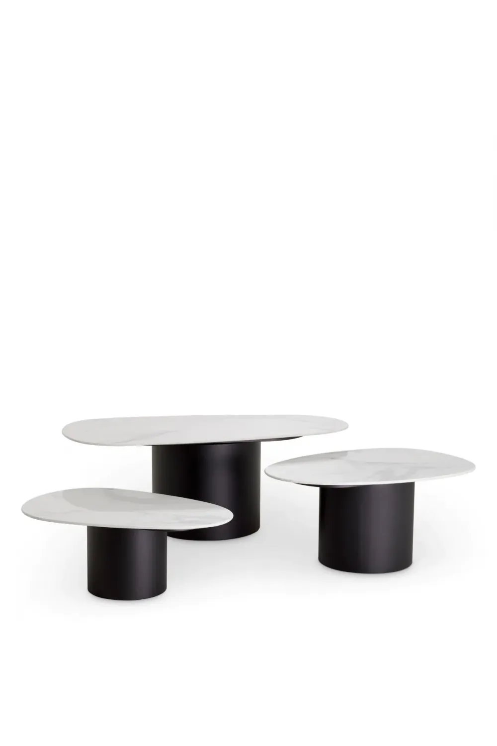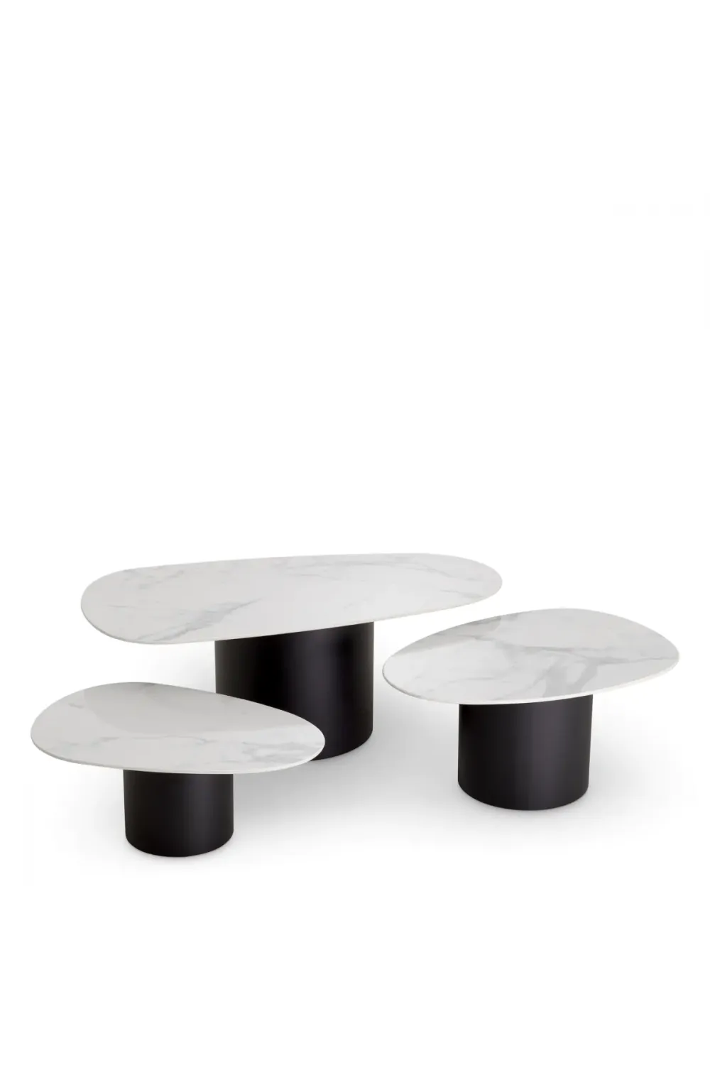 Dieses luxuriöse Couchtisch-Set mit drei skulpturalen Tischen in schwarzem Finish und einer Oberfläche in Keramikmarmor-Optik verleiht raffinierten Interieurs flexible Eleganz und bringt moderne Dekadenz und visuelle Harmonie in luxuriöse Wohnräume.