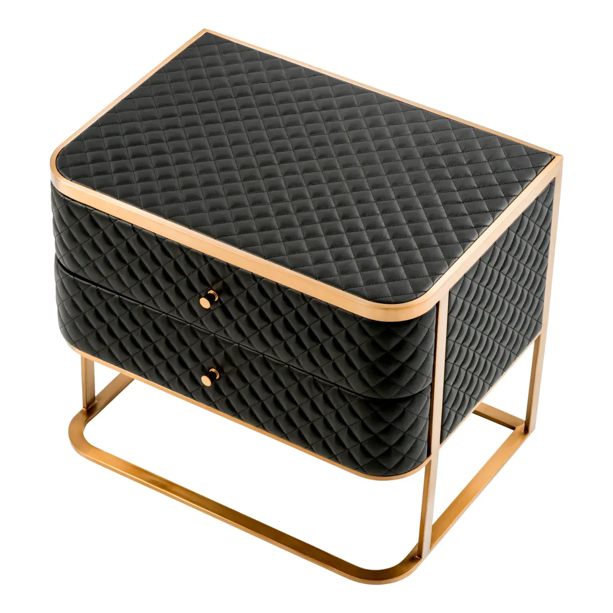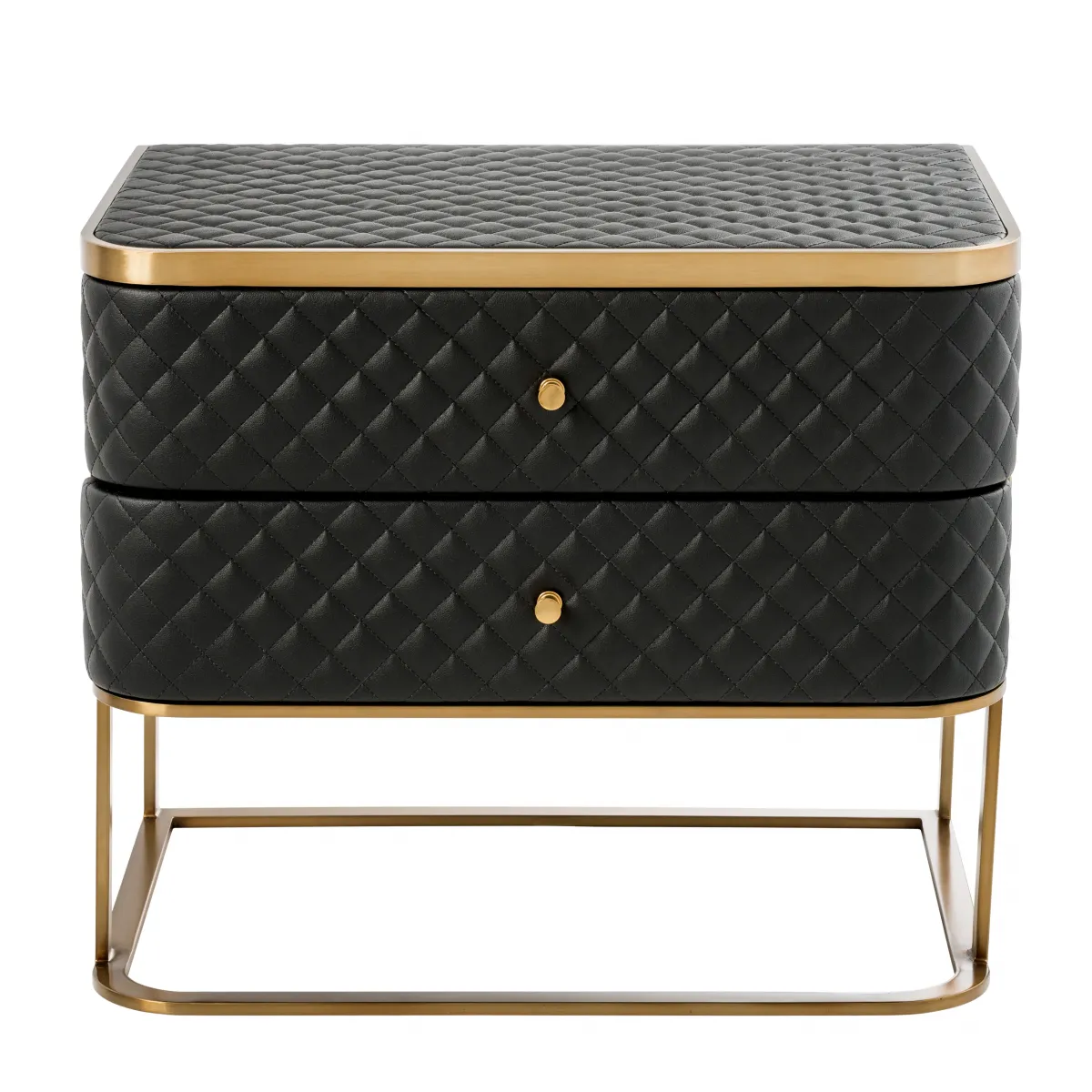 Der luxuriöse Nachttisch aus schwarzem Kunstleder mit diamantförmiger Steppung und einem schlanken Metallrahmen in Messingoptik verleiht skulpturale Raffinesse und edlen Stauraum. Als hochwertiger Luxus-Nachttisch konzipiert, bereichert er europäische Innenräume mit Textur, Wärme und nahtloser Soft-Close-Funktionalität. Die diamantförmig gesteppte Polsterung in Kombination mit einer gebürsteten Messingstruktur definiert mutige Schlafzimmer-Eleganz.