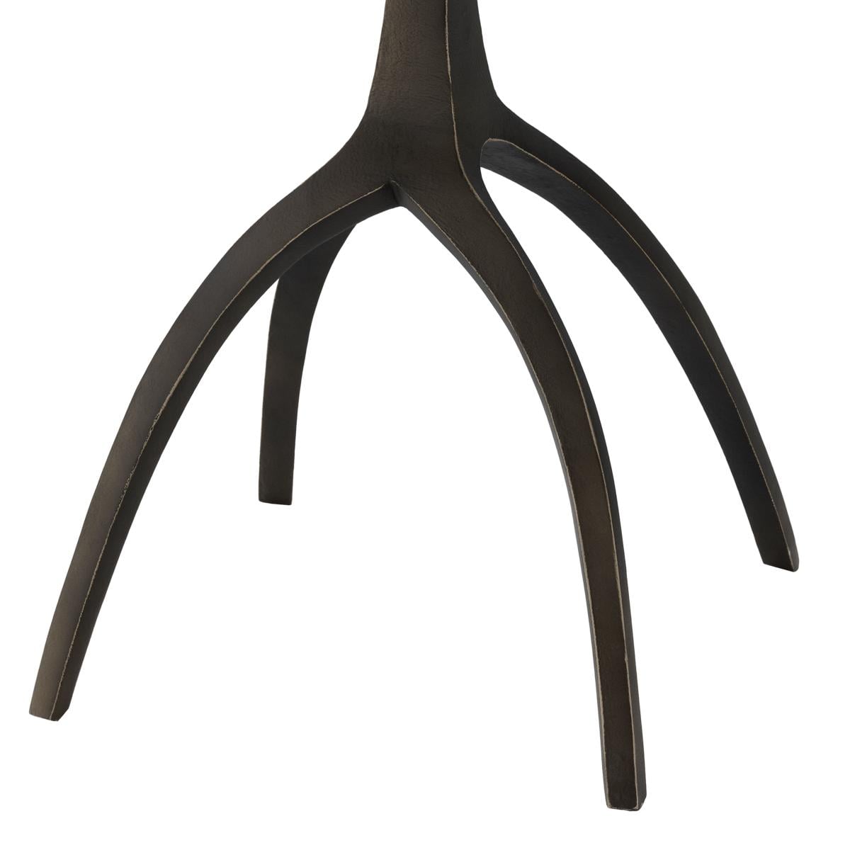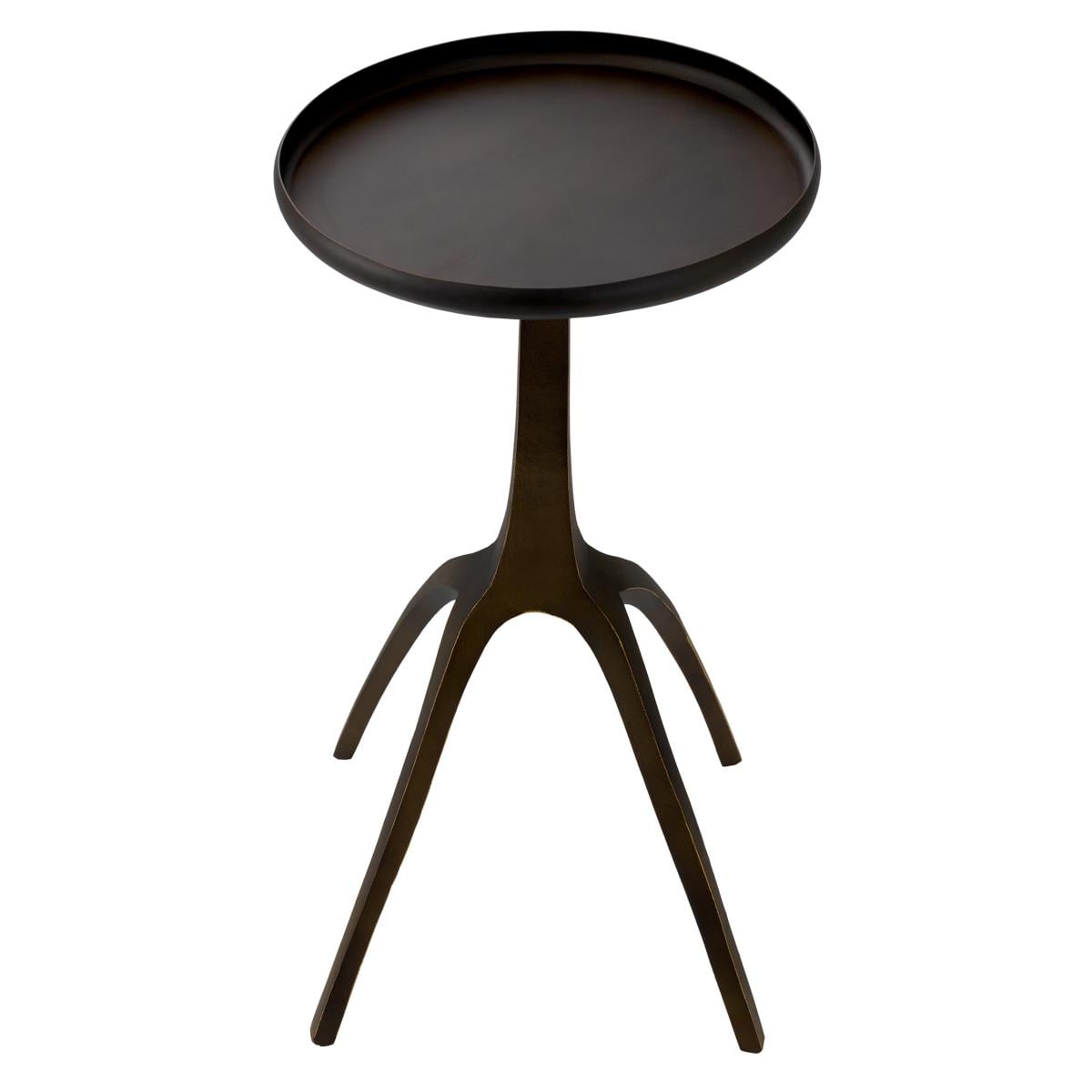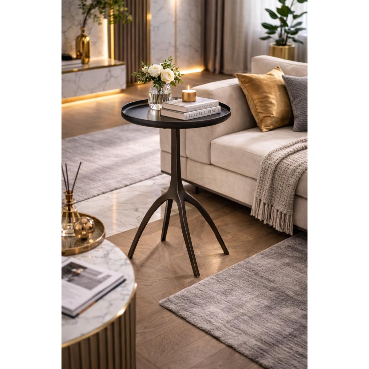 Luxuriöser schwarzer Beistelltisch mit rundem, erhöhtem Rand und bronzefarbenem Finish sowie einem astähnlichen Gestell, der skulpturale europäische Eleganz präsentiert. Dieser edle Luxus-Beistelltisch verfügt über eine runde Tischplatte mit erhöhtem Rand und ein organisch vom Ast inspirierte Gestell, ideal neben einem Sofa oder als markanter Nachttisch in sorgfältig gestalteten Innenräumen.