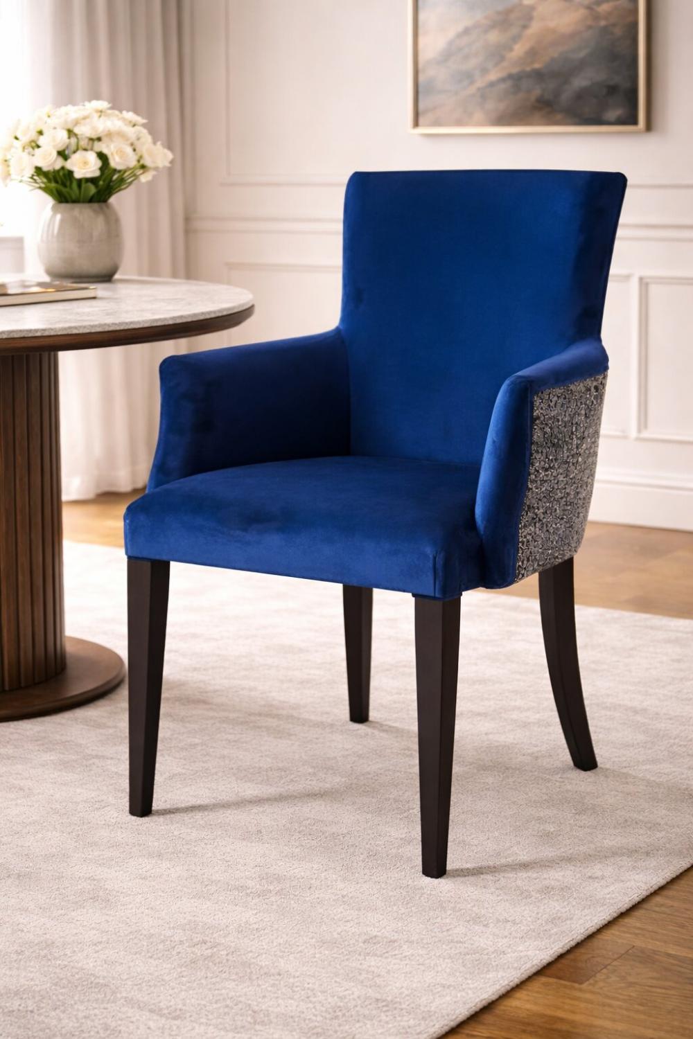Dieser luxuriöse Samt-Esszimmerstuhl kombiniert einen kräftigen blauen Samtbezug mit schlanken Armlehnen und einer strukturierten Rückenlehne. Dieser luxuriöse gepolsterte Esszimmerstuhl ist perfekt für die Einrichtung eines raffinierten, komfortablen Esszimmers und verbindet Raffinesse mit ergonomischem Design, was ihn zu einer idealen Ergänzung für jede Sammlung von Luxus-Esszimmerstühlen macht.