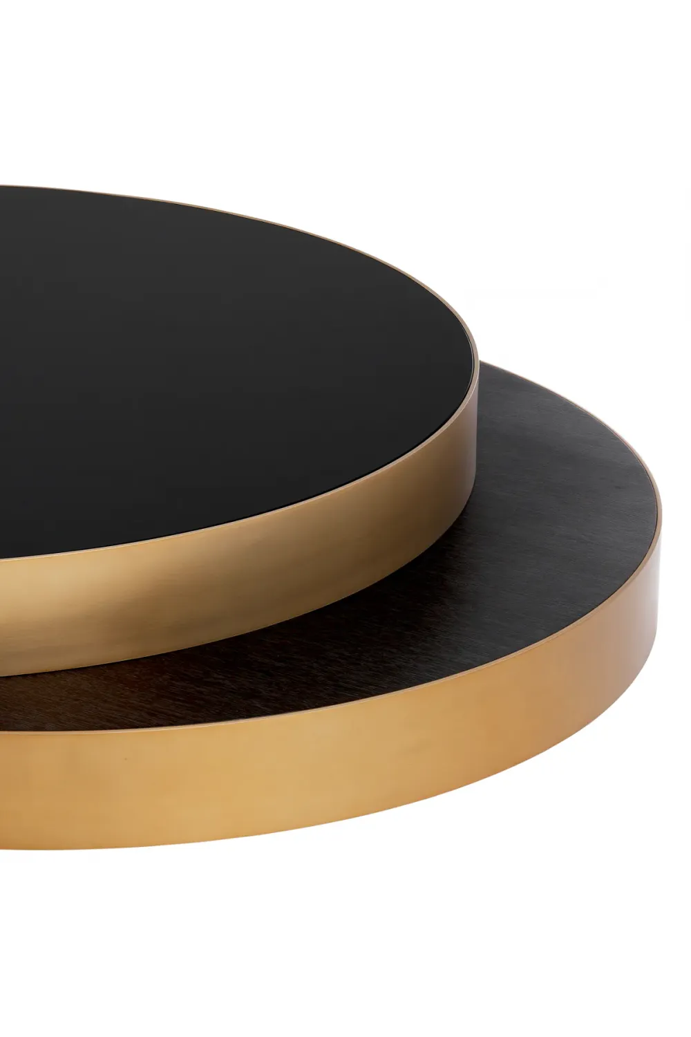 Dieser luxuriöse Couchtisch mit seinem skulpturalen, sich überlappenden Scheibendesign mit Details aus gebürstetem Messing, einer schwarzen Glasplatte und einer Oberfläche aus anthrazitfarbenem Eichenfurnier verleiht raffinierten Innenräumen moderne Eleganz.