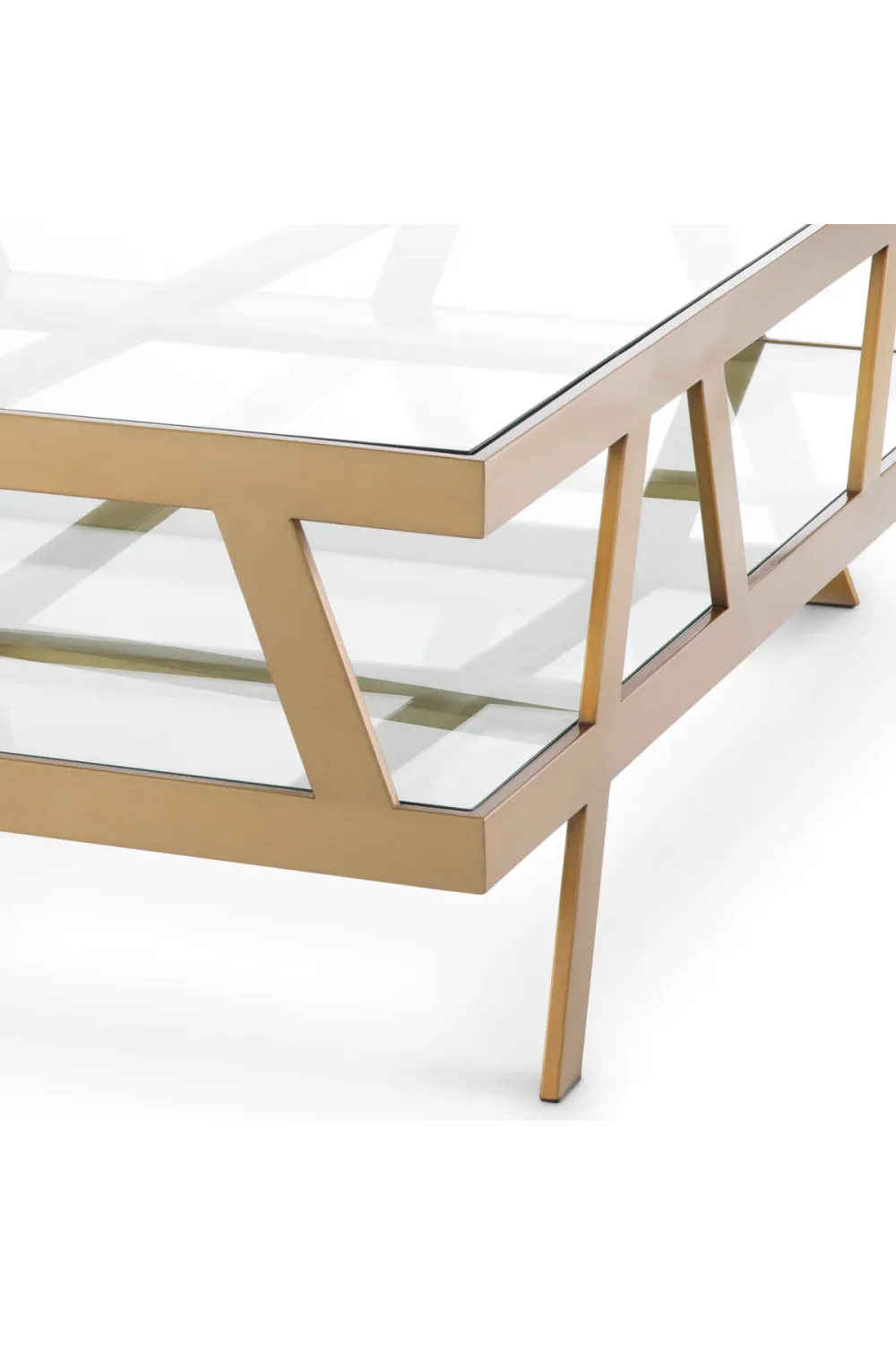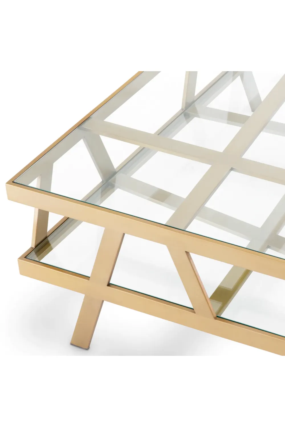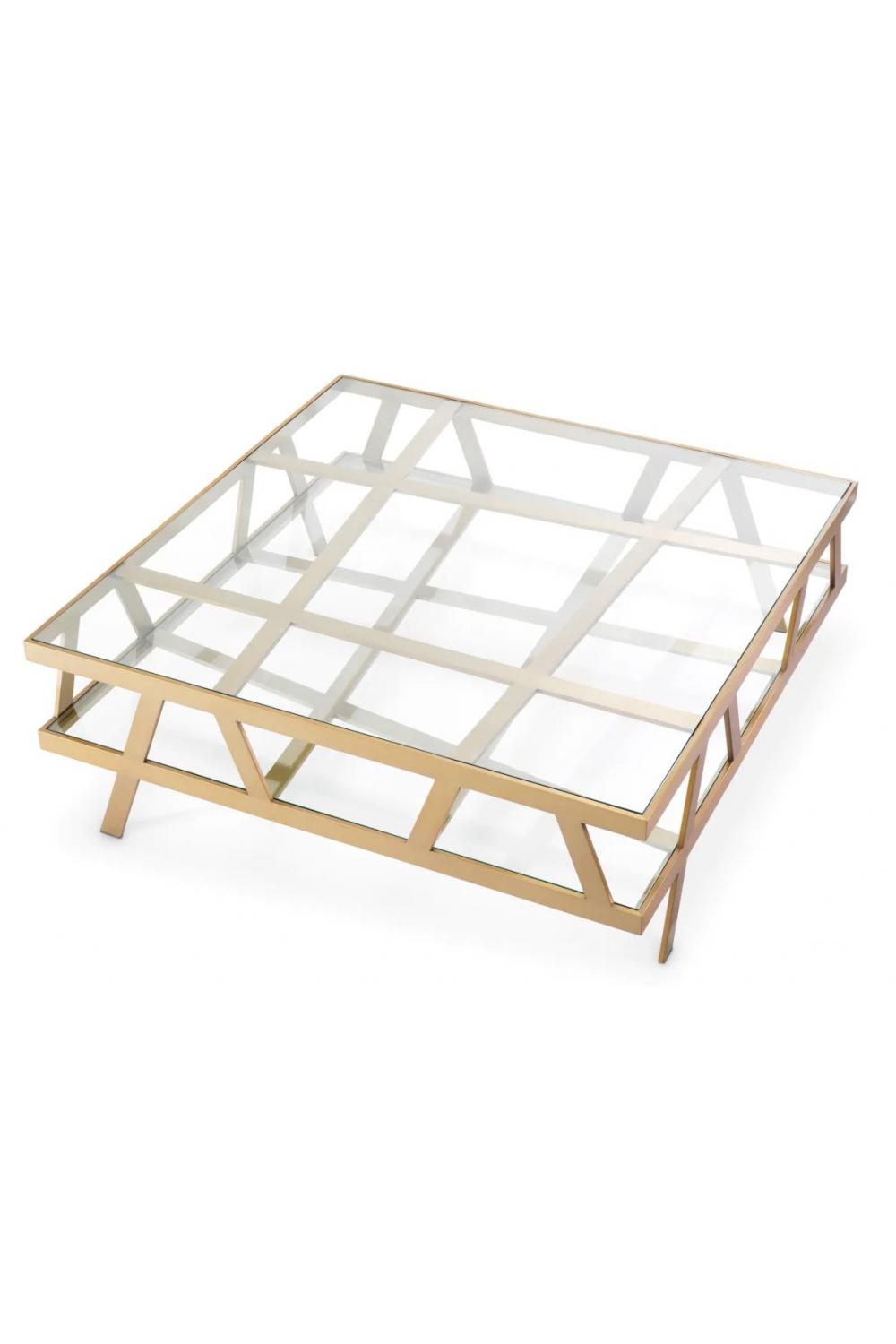 Derquadratische Couchtisch mit Glasplatte aus gebürstetem Messing ist ein zeitgenössisches Statement für Interieurs, die Wert auf edle Materialien und architektonisches Design legen. Dieser elegante quadratische Couchtisch bringt Ausgewogenheit und Symmetrie in moderne Wohnräume. Die transparente Oberfläche macht ihn zu einem raffinierten Couchtisch aus Glas, bei dem die komplizierte Struktur darunter sichtbar bleibt. Seine klare Geometrie und die polierten Materialien machen ihn zum idealen Mittelpunkt für gehobene Wohnungen, die eine raffinierte Mischung aus Form und Funktion suchen.