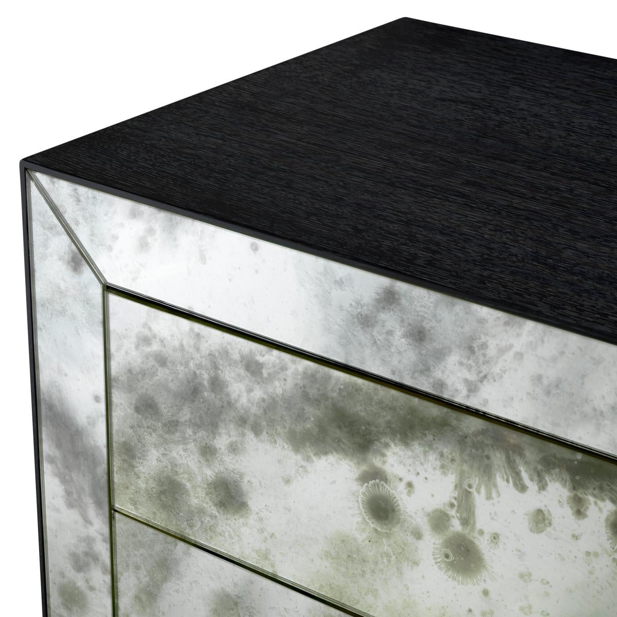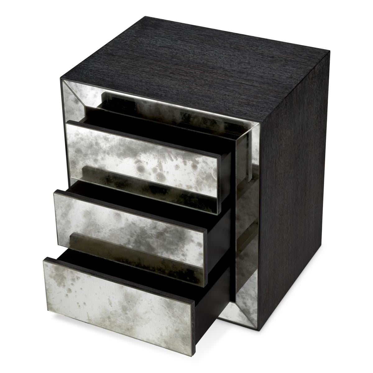 Der luxuriöse Nachttisch aus anthrazitfarbenem Eichenfurnier mit antikem Spiegelglas ist eine Meisterklasse in raffiniertem europäischem Design. Sein Rahmen aus anthrazitfarbenem Eichenfurnier strahlt Tiefe und modernen Charakter aus, während die Fassade aus antikem Spiegelglas ein fesselndes Zusammenspiel von Textur und Licht erzeugt. Die abgeschrägten Spiegelpaneele rahmen drei großzügige Schubladen ein, die jeweils mit einem sanften Push-to-Open-Mechanismus ausgestattet sind, der eine nahtlose Silhouette gewährleistet. Klare architektonische Linien und subtile Details machen dieses Stück sowohl funktional als auch skulptural - ideal für anspruchsvolle Schlafzimmer, die nach dezentem Glamour suchen.