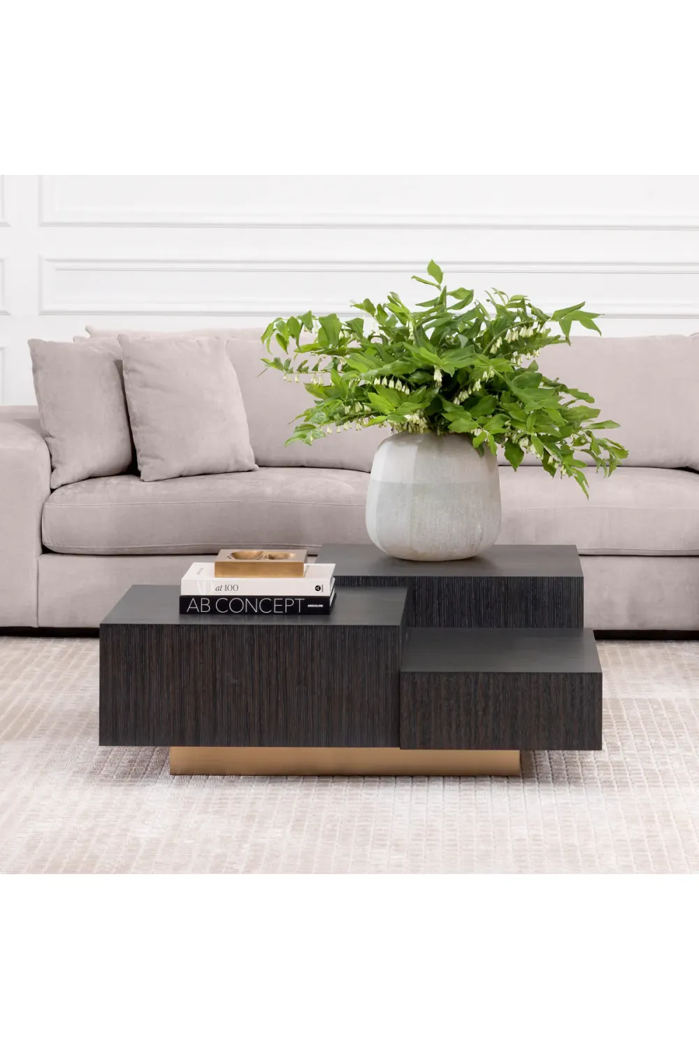 Dieser luxuriöse Couchtisch aus anthrazitfarbenem Eichenfurnier mit Details aus gebürstetem Messing verbindet architektonische Eleganz mit alltäglicher Funktionalität und sorgt für einen raffinierten, modernen Stil.