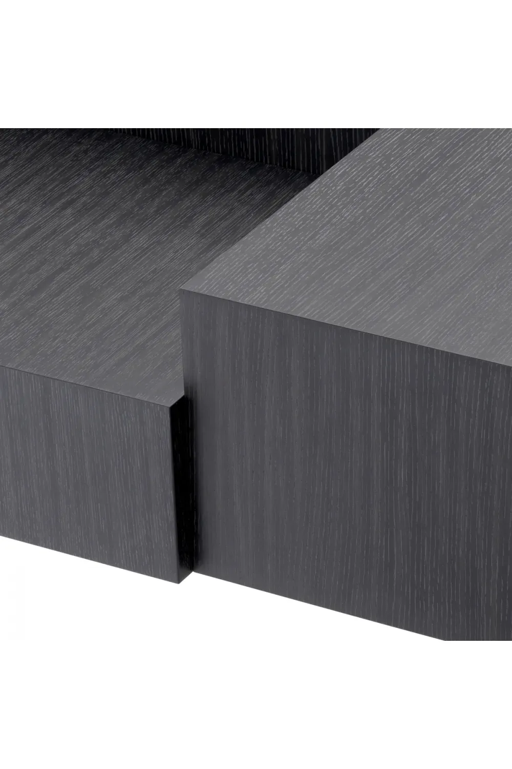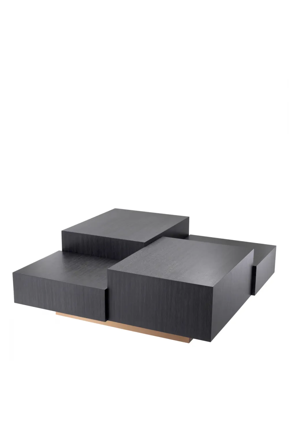 Dieser luxuriöse Couchtisch ist aus einem reichen , anthrazitfarbenen Eichenfurnier gefertigt, das eine natürliche Textur und Tiefe aufweist , die durch warme , gebürstete Messingakzente gemildert wird, die die Gesamtästhetik des Tisches aufwerten. Die geviertelte Tischplatte besteht aus vier verschiedenen Abschnitten, die auf mehreren Ebenen angeordnet sind, wodurch ein dynamischer visueller Effekt entsteht, der sowohl modern als auch designorientiert wirkt. Diese geschichtete Komposition verleiht dem Tisch eine Dimension und hebt gleichzeitig die Handwerkskunst hervor, wodurch er sich mühelos in die Reihe der hochwertigen , modernen Couchtische einreiht, die für zeitgenössische europäische Innenräume entworfen wurden.