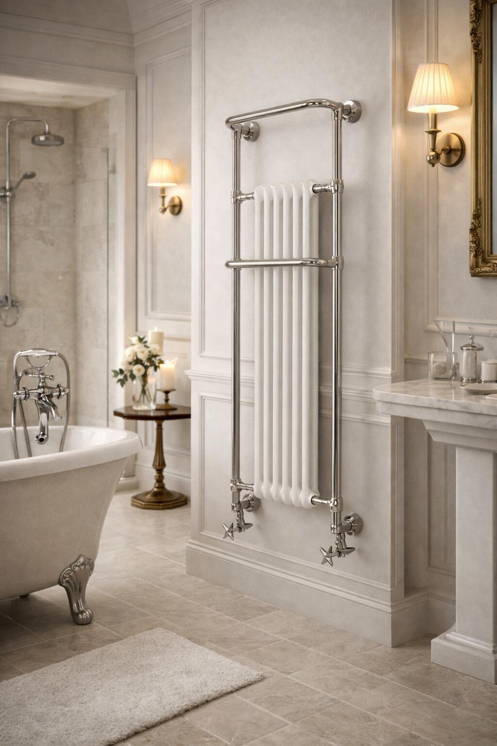 Dieser beheizte Handtuchhalter ist so konzipiert, dass er sich nahtlos in ein elegantes Interieur einfügt und sich mühelos mit raffinierten Luxus-Badezimmereinrichtungen kombinieren lässt, so dass Wärme, Stauraum und visuelle Harmonie kompromisslos nebeneinander bestehen können. Während die verchromte Ausführung einen klaren und modernen Ausdruck bietet, können diejenigen, die eine wärmere, von der Vergangenheit inspirierte Alternative suchen, auch den vergoldeten Designer-Handtuchhalter für das Badezimmer in Betracht ziehen, der die gleiche architektonische Struktur mit einer reichhaltigeren Klangpräsenz bietet. Zusammen unterstützen diese Ausführungen ein kohärentes Styling in eleganten Designer-Handtuchhaltern für Badezimmerkollektionen.