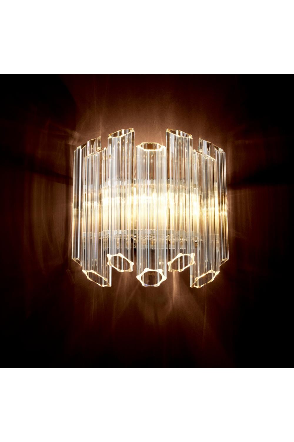 Einzeln oder paarweise installiert, bringt diese klare Glas-Wandleuchte Glamour, Tiefe und raffinierte Brillanz in Interieurs, die für anspruchsvolle europäische Luxus-Käufer kuratiert sind.