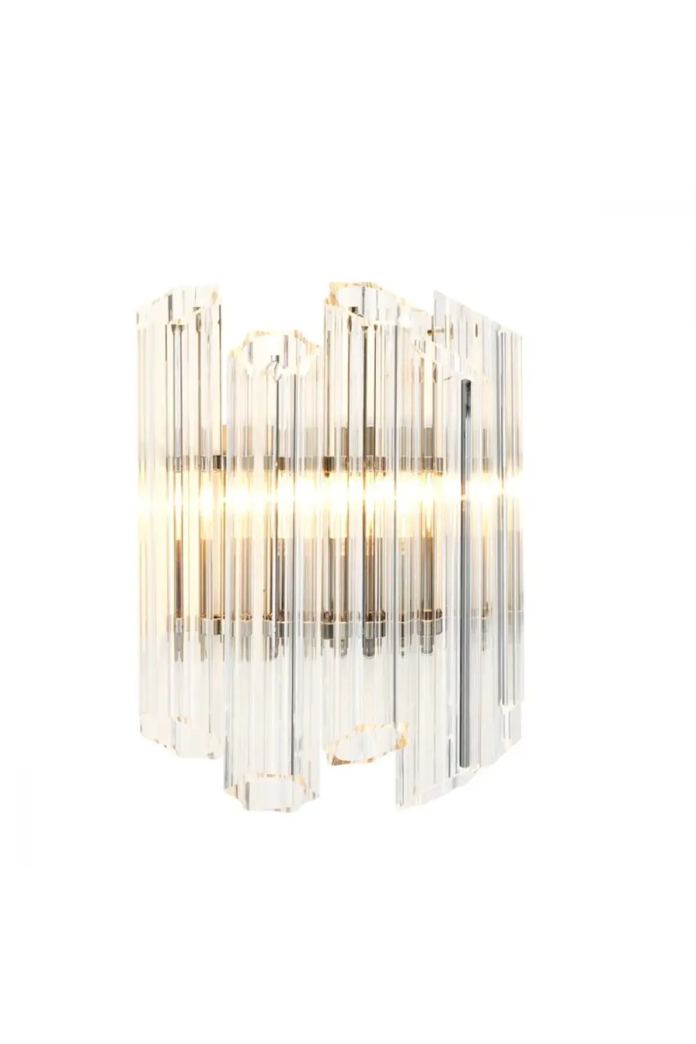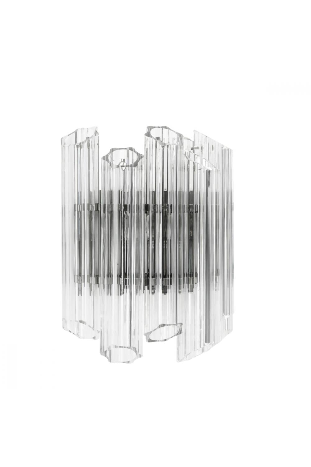 Das Design zeichnet sich durch vertikal gerippte und fein facettierte klare Glaselemente aus, die das Licht mit bemerkenswerter Brillanz einfangen und brechen. Diese kristallähnlichen Glasplatten sind sorgfältig um einen polierten Nickelrahmen angeordnet und schaffen eine geschichtete Komposition, die beim Beleuchten wunderschön leuchtet. Als klare Glas-Wandleuchte bietet sie funkelnde Klarheit und bewahrt gleichzeitig eine ausgewogene, architektonische Struktur.