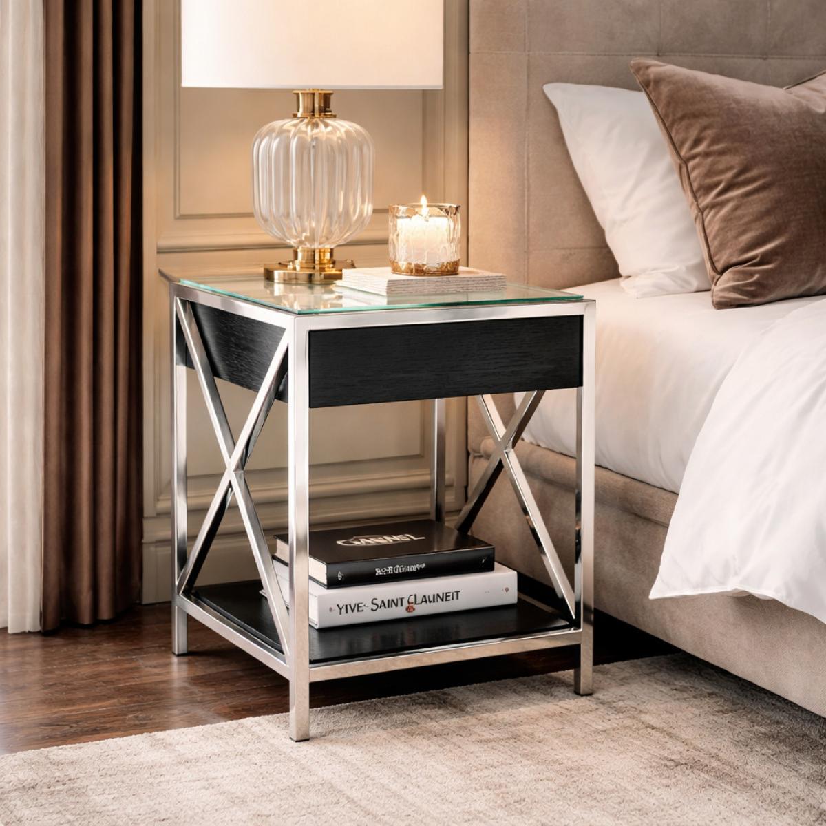 Der luxuriöse Nachttisch aus Eichenfurnier mit Edelstahl-Cross-Design ist ein Meisterwerk strukturierter Eleganz und urbanen Glamours. Gefertigt mit einem polierten Edelstahlrahmen, liegt sein charakteristisches Merkmal in den skulpturalen Kreuzseitenpaneelen, die visuelles Rhythmus und architektonisches Gleichgewicht schaffen. Die Schublade und das untere Regal aus Eichenfurnier bringen Wärme und Tiefe, während die abgeschrägte Spiegelglasplatte die Lichtreflexion für ein veredeltes Finish verstärkt. Entworfen für zeitgenössische europäische Innenräume, bietet dieser luxuriöse Nachttisch aus Eichenfurnier mit Edelstahl-Cross-Design sowohl ästhetische Unterscheidung als auch funktionalen Stauraum durch sein sanftes Push-to-Open-Schubladensystem.